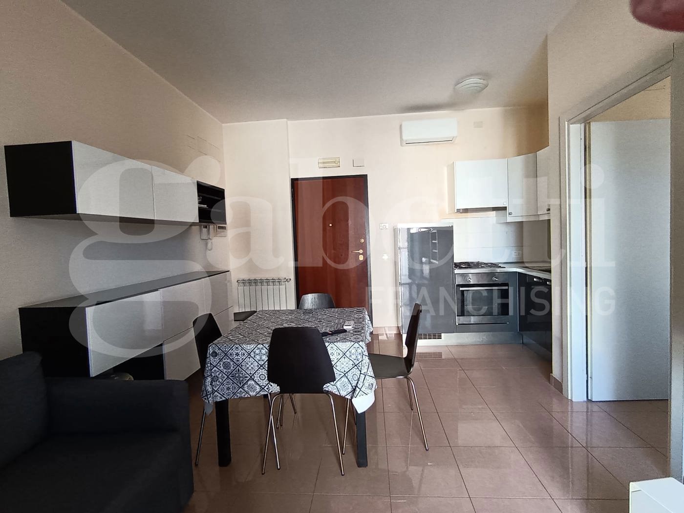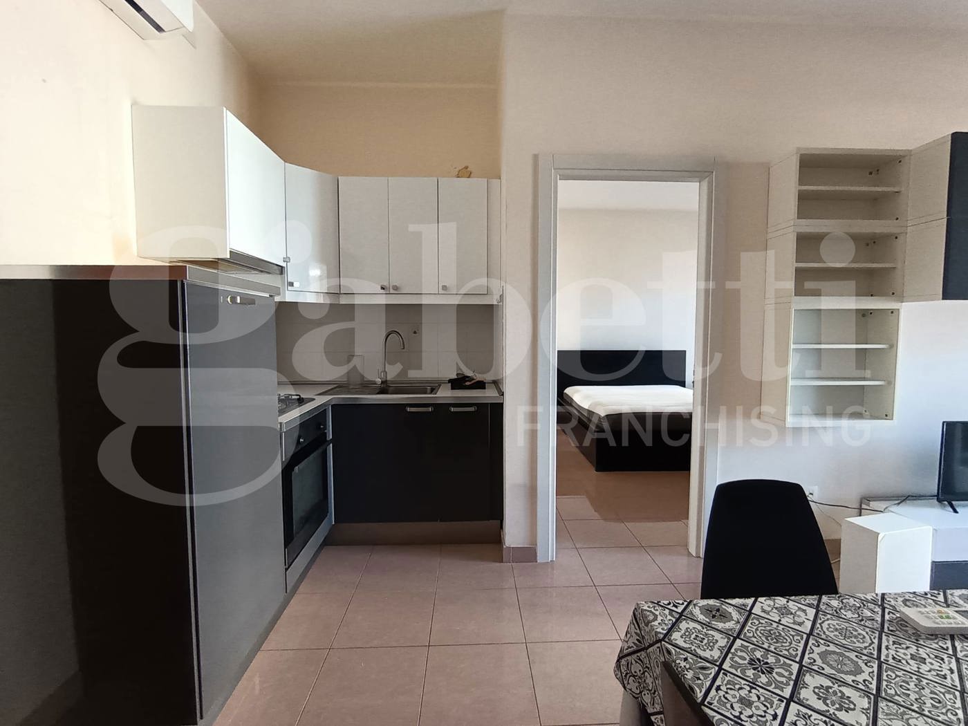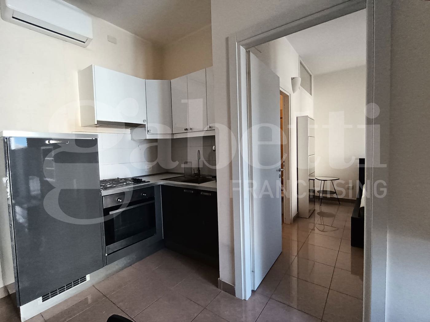 La casa ha ingresso su cucina soggiorno con accesso al balcone, camera da letto matrimoniale con accesso al balcone, bagno con doccia e lavatrice.