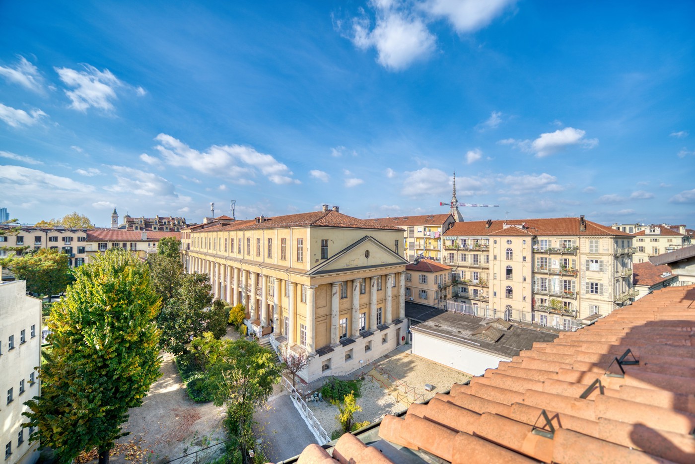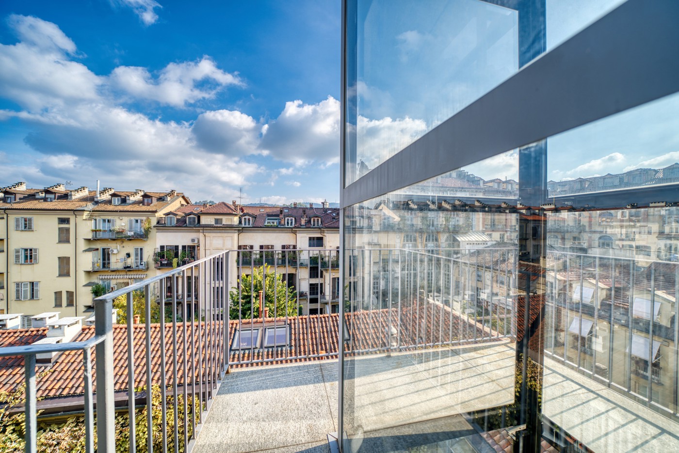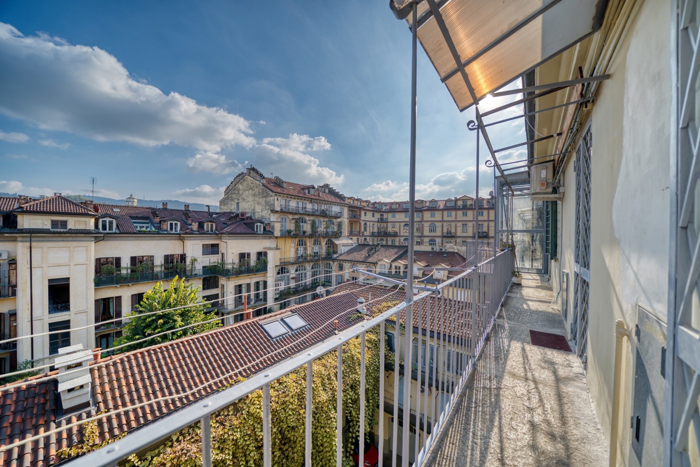 L'appartamento ha accesso da ballatoio, servito al piano da ascensore ed offre un'affascinante vista sui tetti dell'antica Torino, verso la collina dal lato soggiorno e verso le Alpi dal lato camera, con veduta sulla Basilica di Superga, Monte dei Cappuccini, Mole Antonelliana e Istituto delle Rosine.