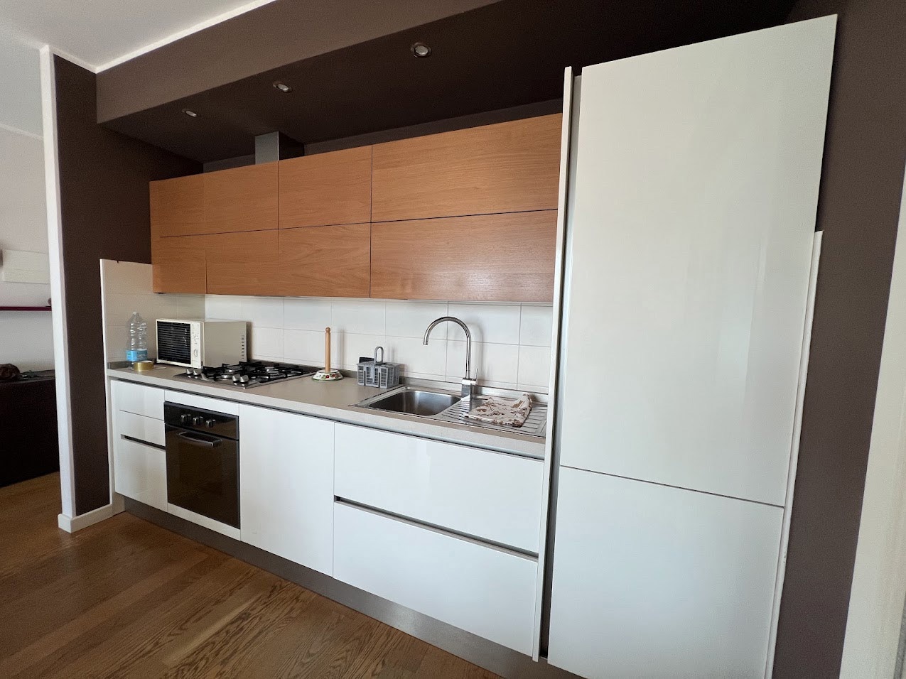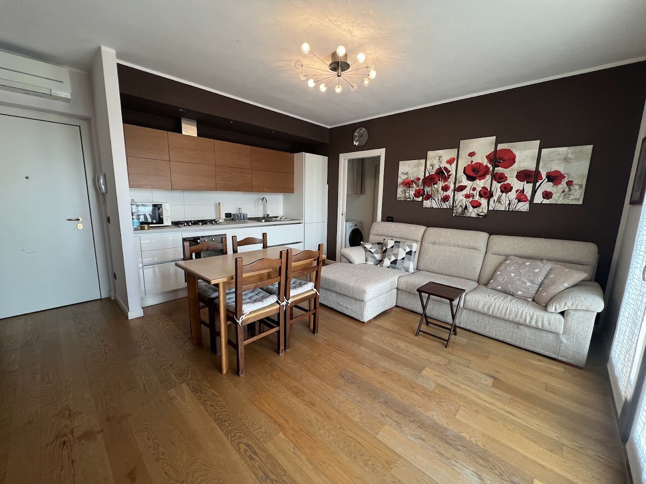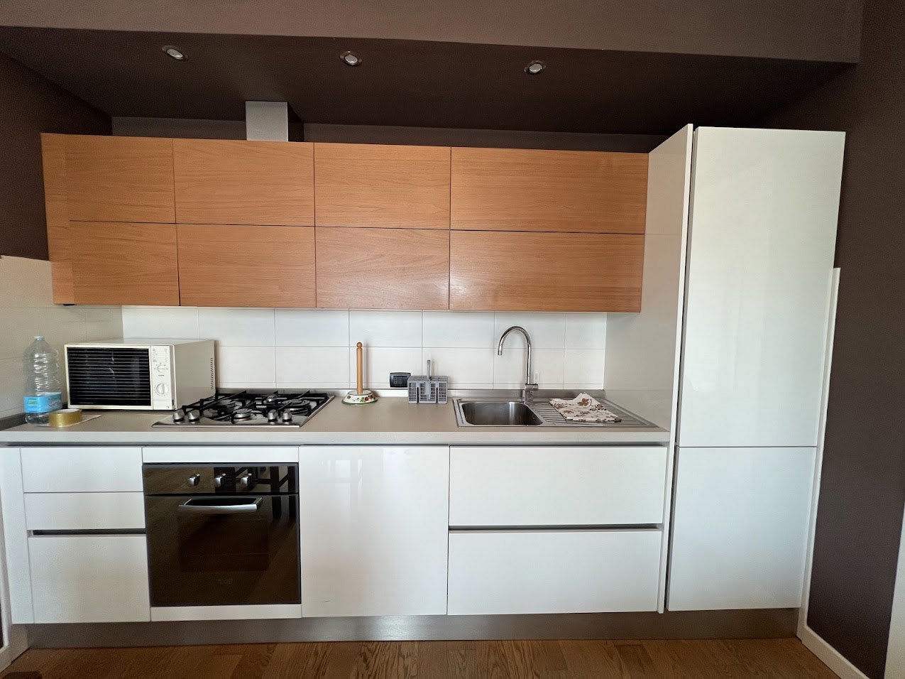 Lingresso si apre direttamente sul soggiorno con angolo cottura, uno spazio accogliente e luminoso, dal quale si accede a un ampio terrazzo, perfetto per pranzi e cene allesterno.