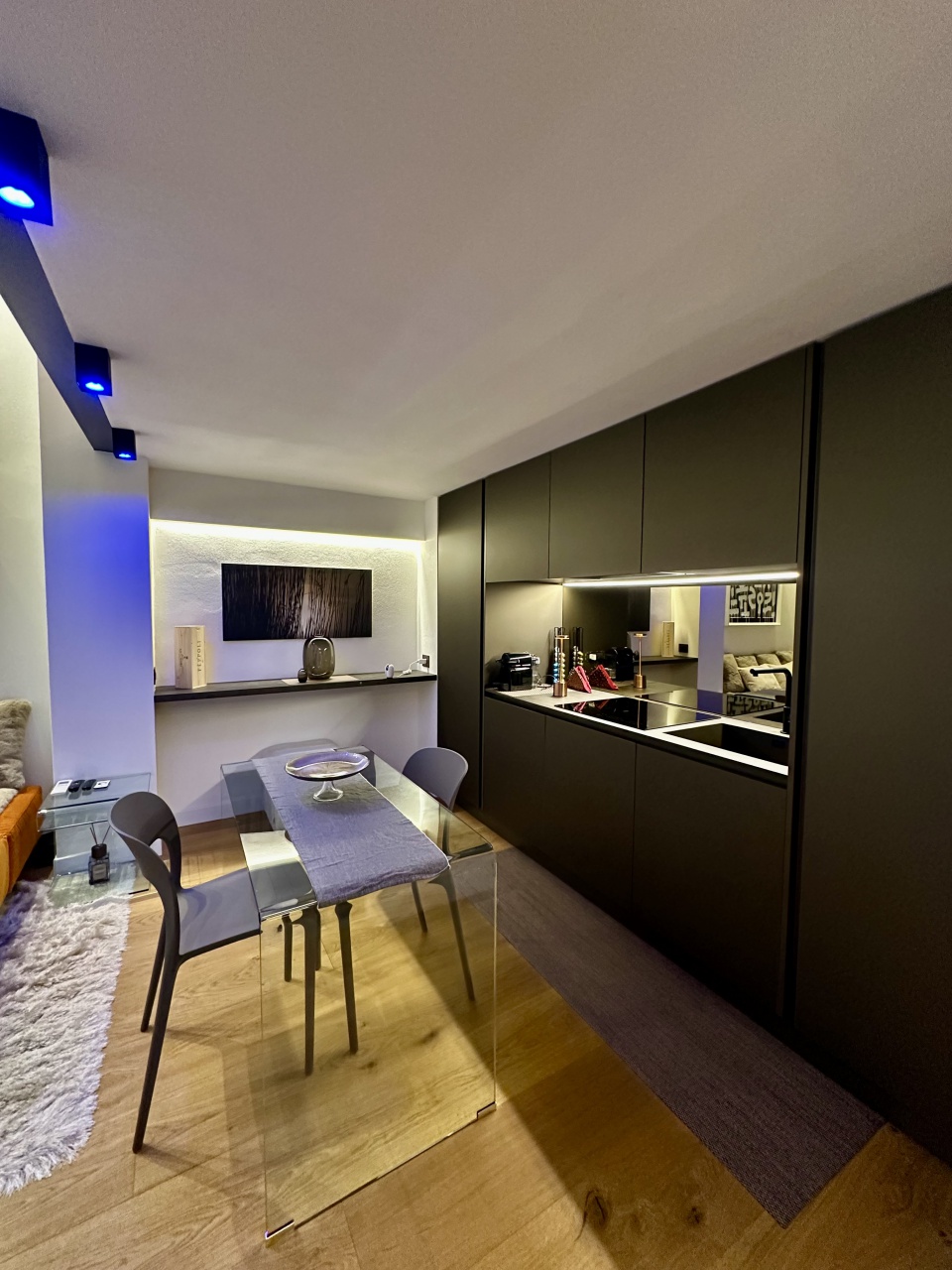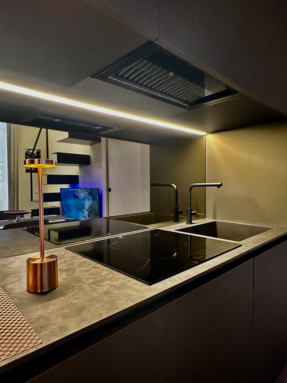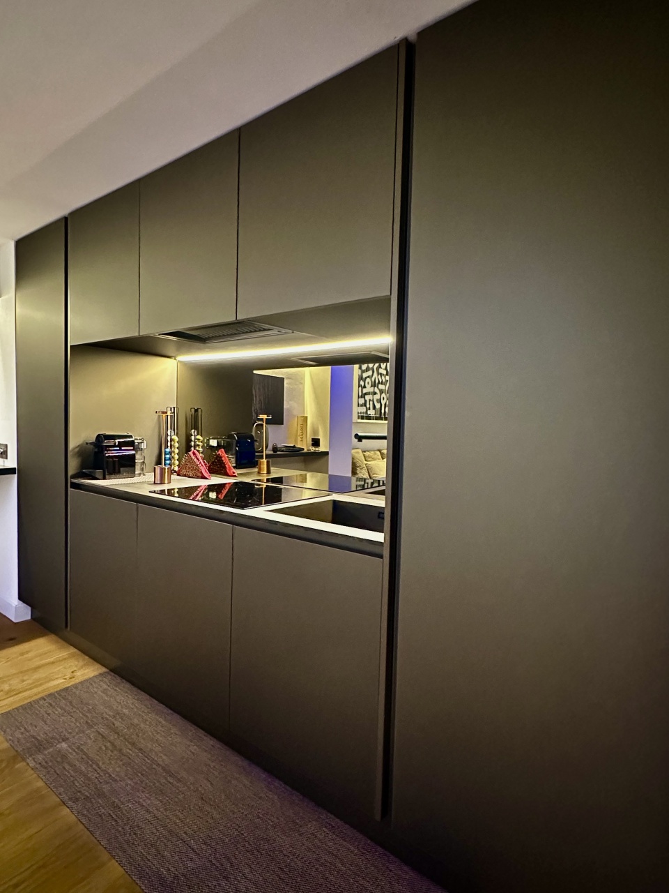 La cucina è uno spazio inglobato nella zona giorno, equipaggiata di tutti gli elettrodomestici essenziali, fuochi ad induzione, frigorifero con congelatore, lavastoviglie, lavatrice / asciugatrice, cappa aspirante e macchinetta del caffè e tutto ciò di cui si può avere bisogno in uno spazio ben organizzato e ordinato.