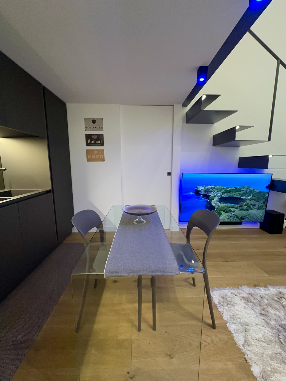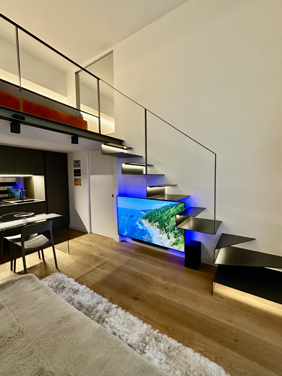 Il grande divano letto, l'ampio televisore da 70 pollici, il tavolo da pranzo in vetro, la cucina e la scala in ferro battuto sono esempi di come l'arredamento sia capace di esaltare i punti di forza di questo locale coordinando il tutto armoniosamente.