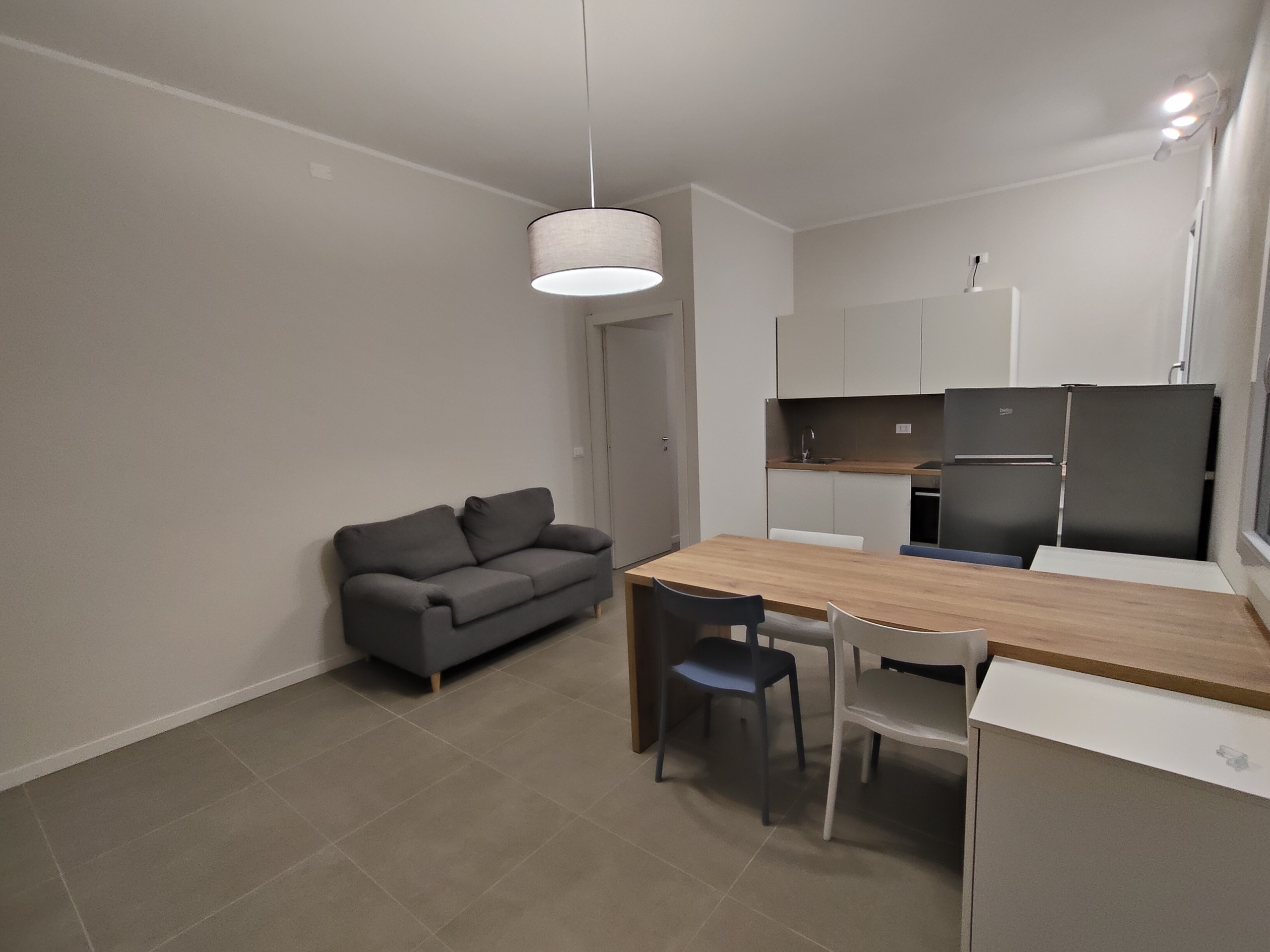 Lingresso si apre direttamente sulla zona giorno che ospita un soggiorno con cucina a vista, attrezzata con lavastoviglie e moderni fuochi a induzione per la massima efficienza in cucina.
