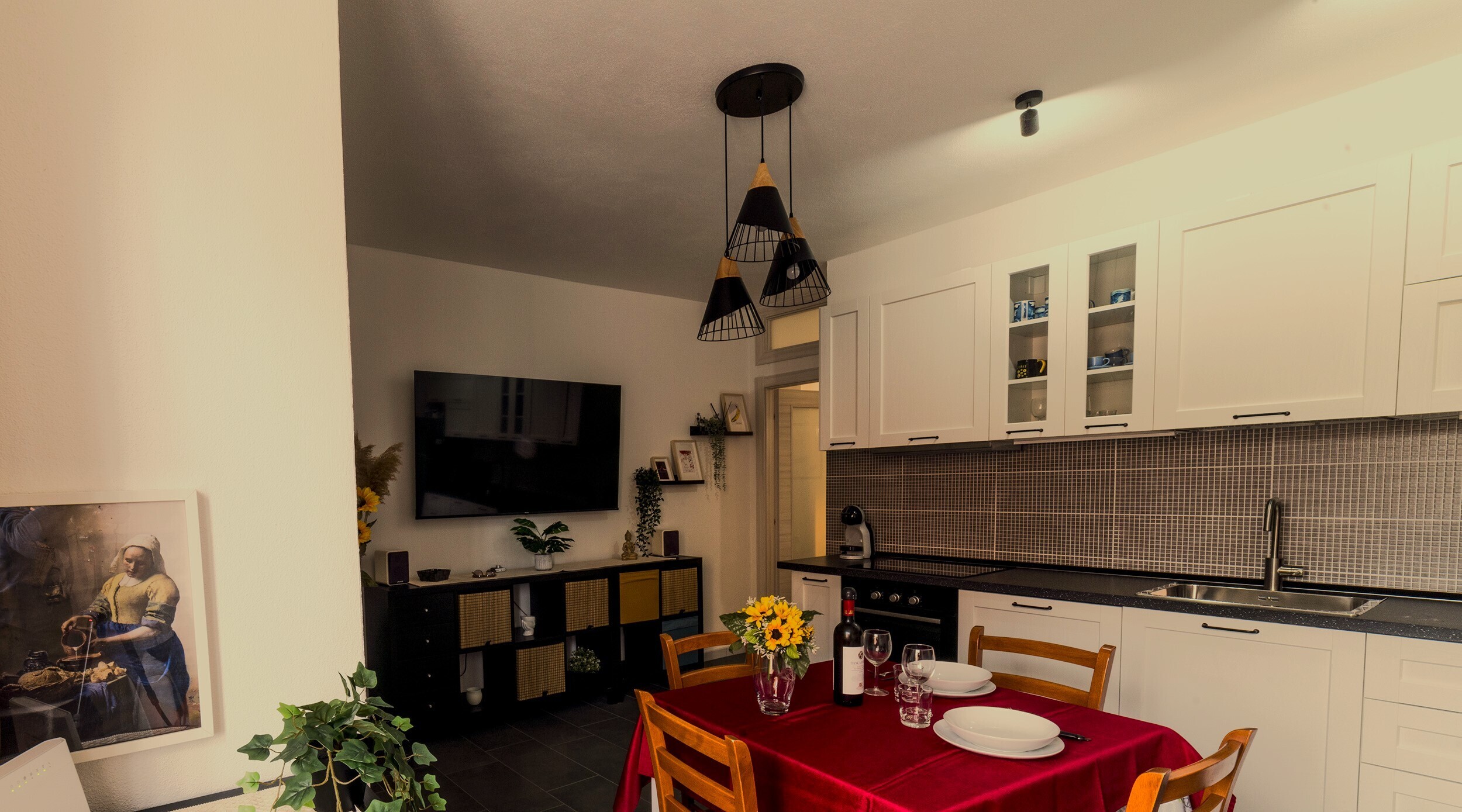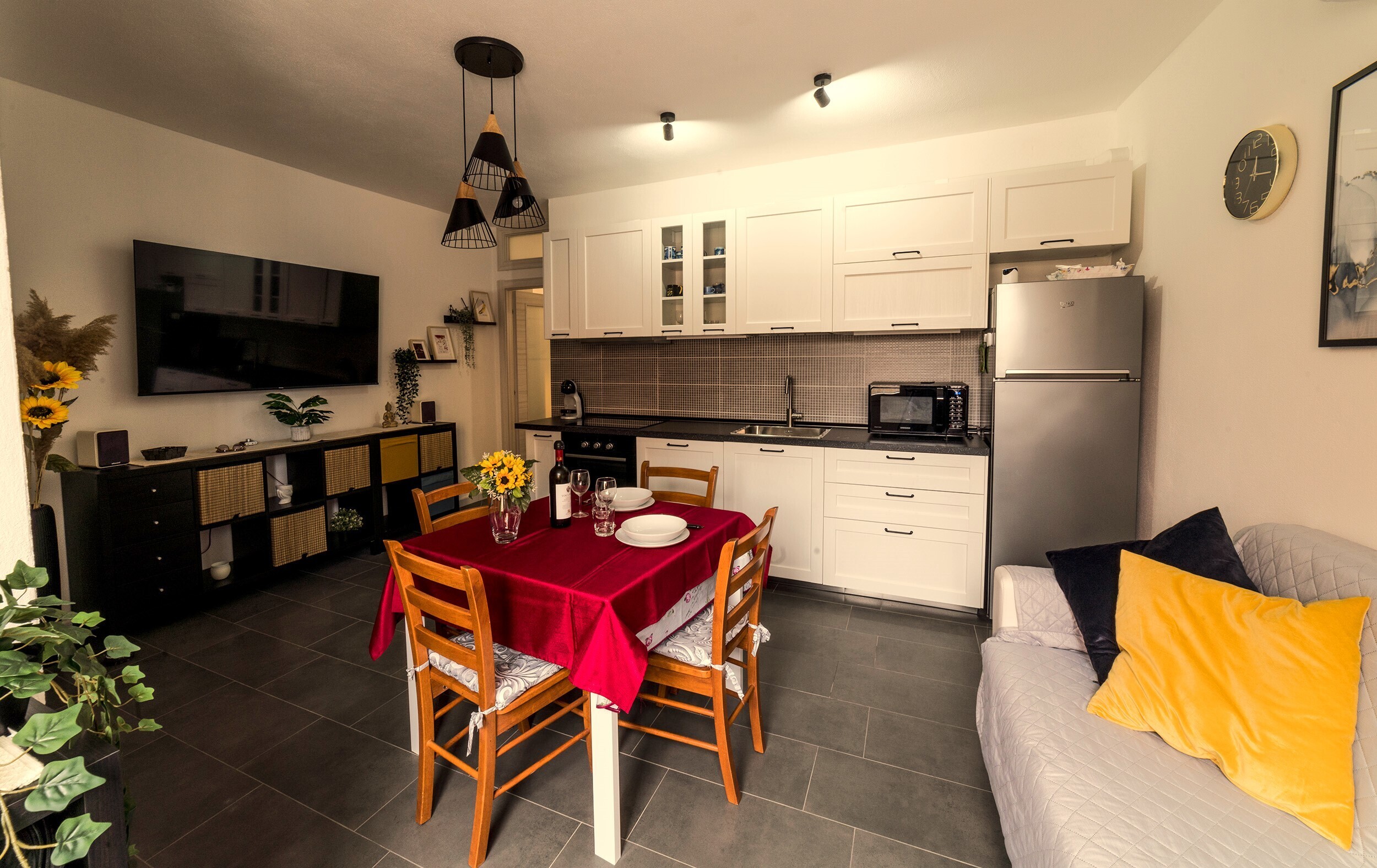 La zona giorno è funzionale e contemporanea, dotata di Smart TV da 65 con servizi di streaming in 4K e di un angolo cottura super attrezzato.