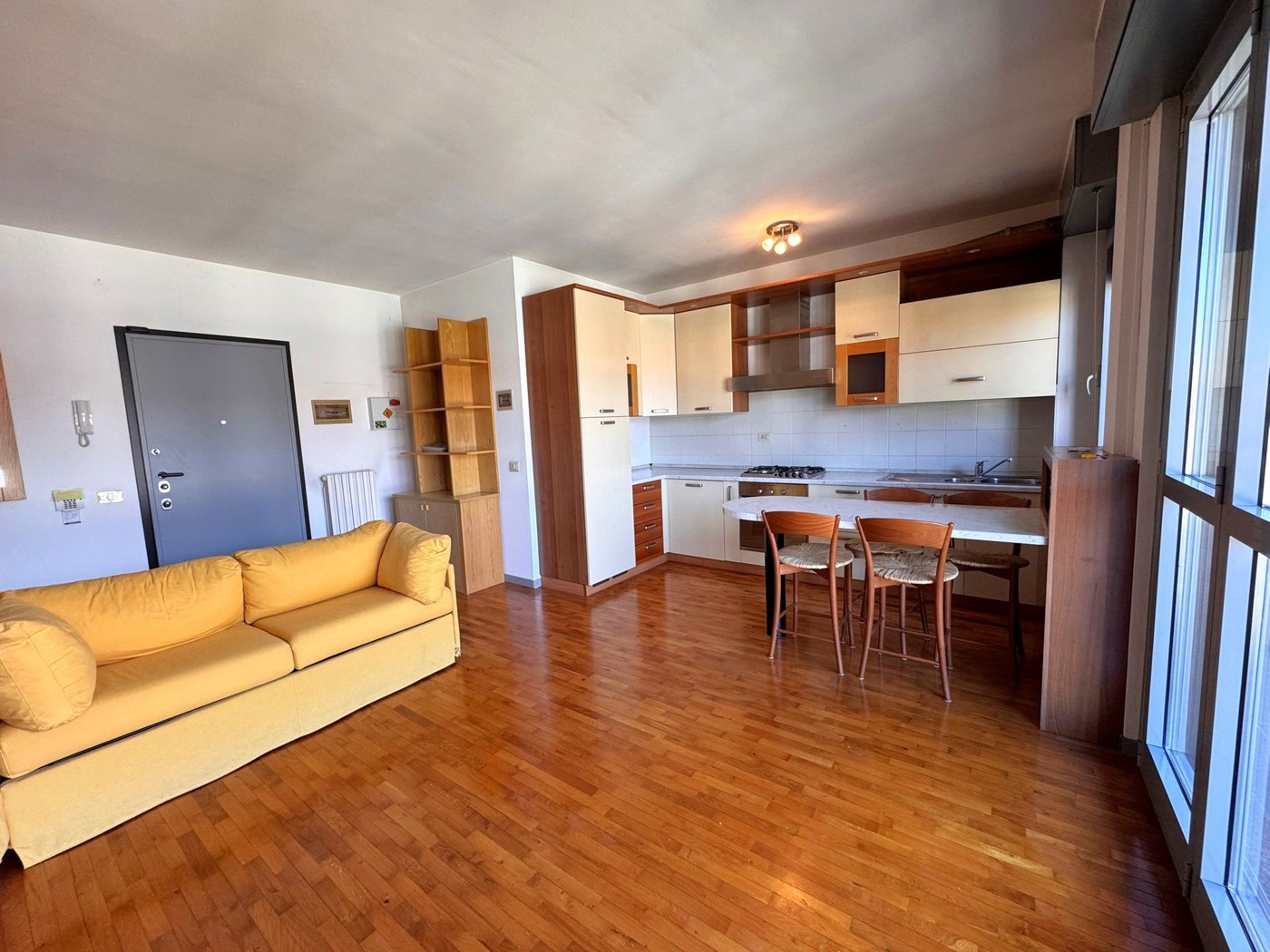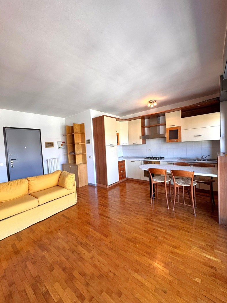 Dall'ingresso disimpegnato, arredato con armadiatura a muro, si accede all'ampio living servito da balcone e alla cucina separata ed abitabile; la zona notte caratterizzata da due camere matrimoniali, una delle quali servita da balcone e dal bagno con doccia.