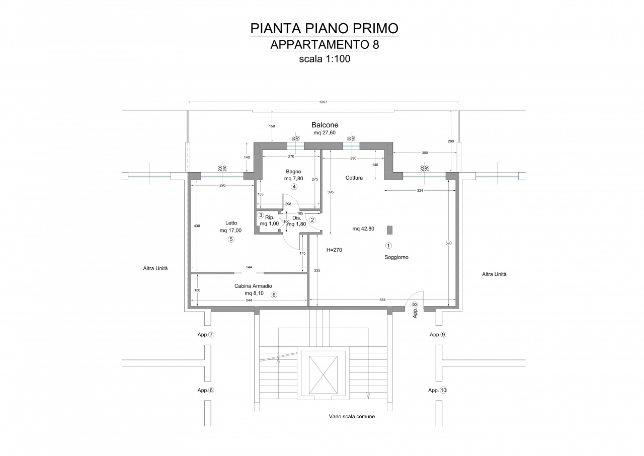 L'appartamento in oggetto sarà composto da ampio soggiorno e cucina di circa 42 mq, bagno padronale , disimpegno con attacchi lavatrice e asciugatrice, camera matrimoniale dotata di una incantevole cabina armadio e un comodo terrazzo.