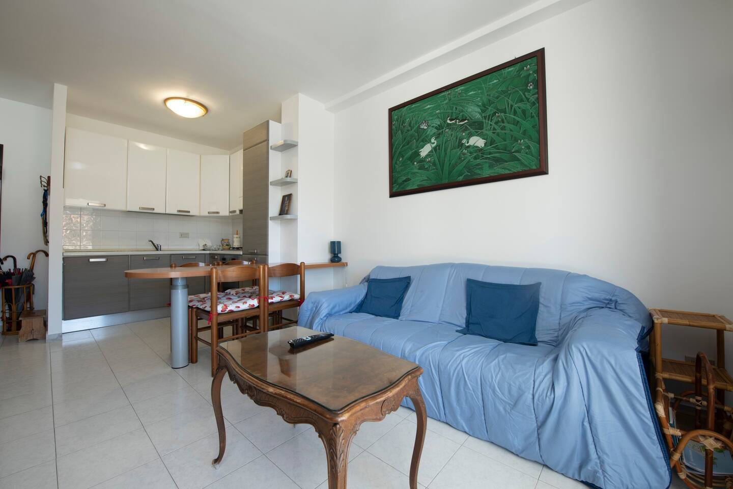Entrando troverete subito un'ampia e luminosa zona giorno, con divano letto per due persone, tv e tavolo da pranzo all'americana.