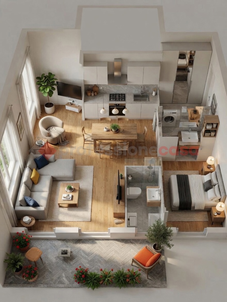 La zona giorno si apre con un ingresso che introduce al soggiorno con la cucina a vista, perfetto per chi ama vivere e ricevere con stile.