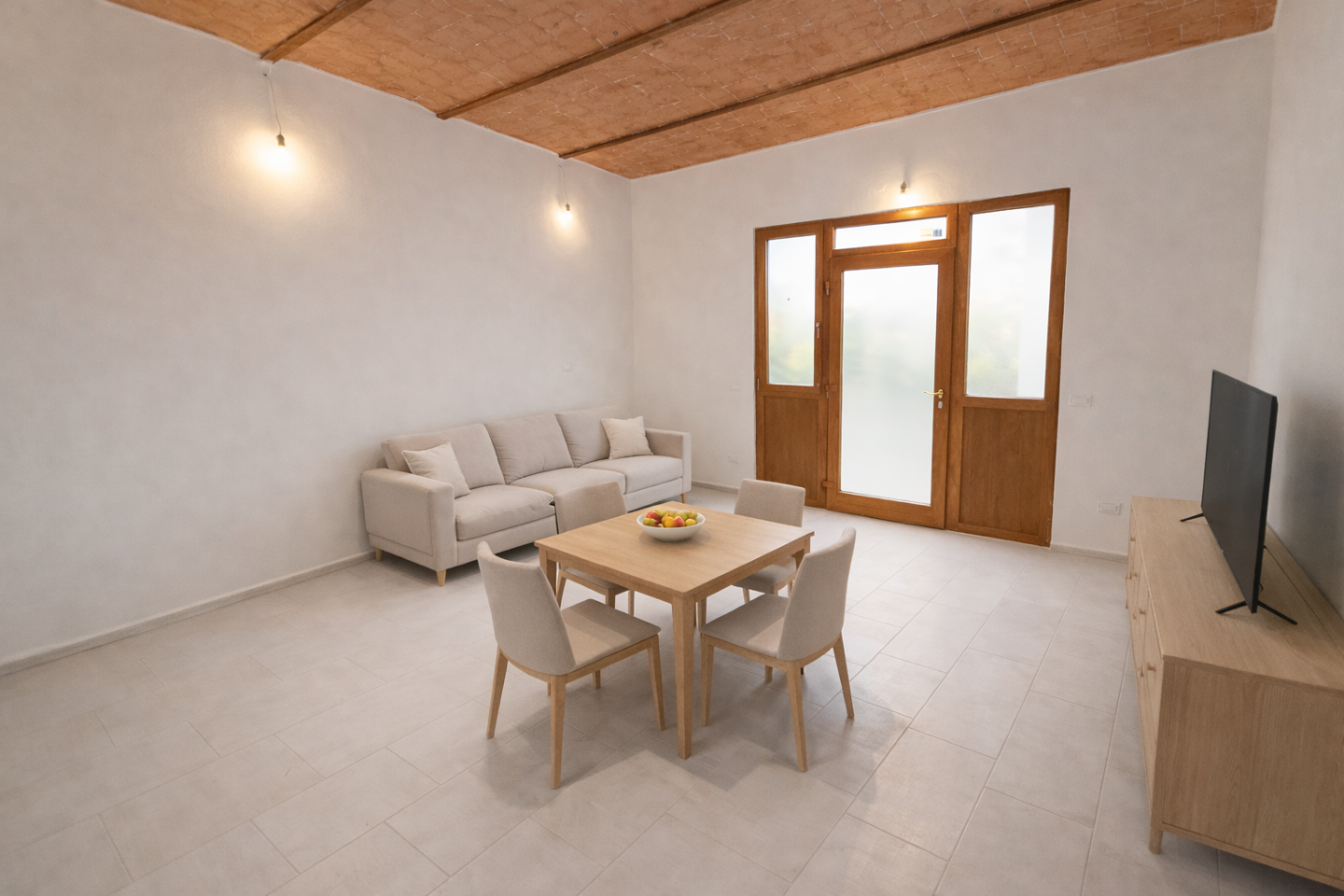 La vecchia bottega è stata ripensata con tecnologie di nuova generazione: il calore uniforme del riscaldamento a pavimento, infissi in PVC con vetro a bassa dispersione, impianti completamente nuovi, finiture chiare e moderne che donano luminosità e armonia agli ambienti.