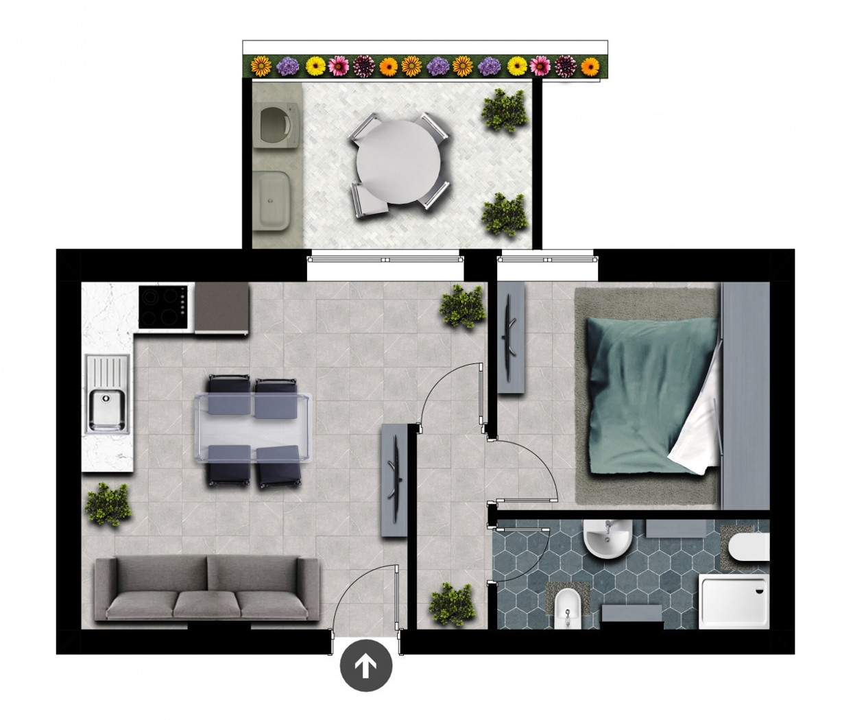 Lappartamento, di circa 49 mq stato progettato per ottimizzare ogni spazio e garantire una distribuzione funzionale degli ambienti, composto da una luminosa zona living, una camera da letto e un bagno.