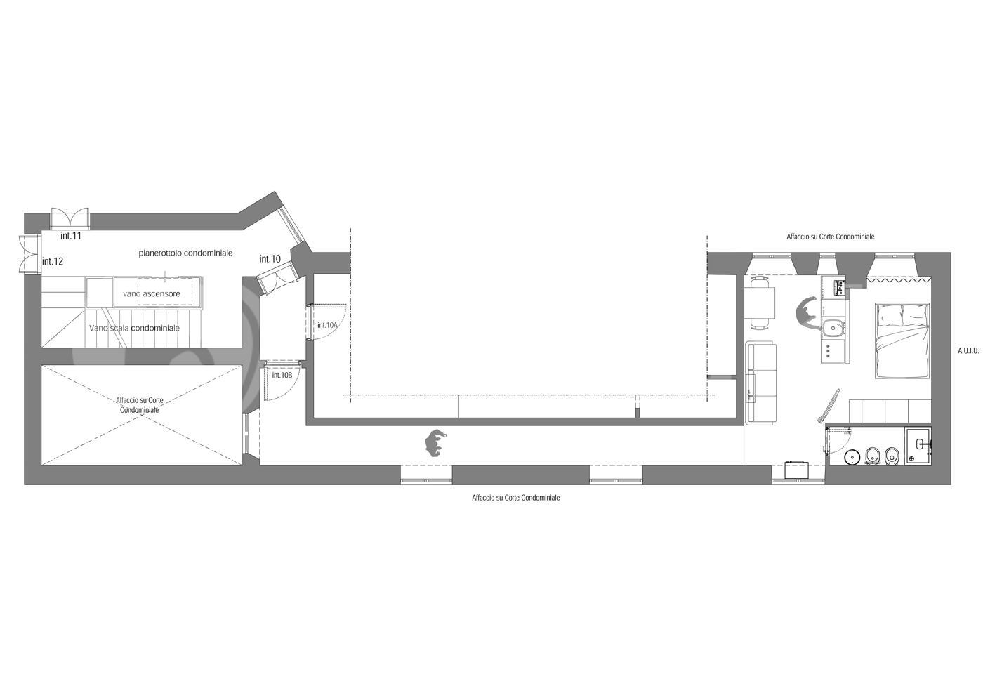 Peculiarit la presenza di sette finestre che donano al appartamento un importante riscontro di luce e di aria. Alla fine di questo lungo corridoio troviamo quindi un soggiorno con angolo cottura con tre finestre, una zona notte dotata anche essa di finestra e un bagno cieco.