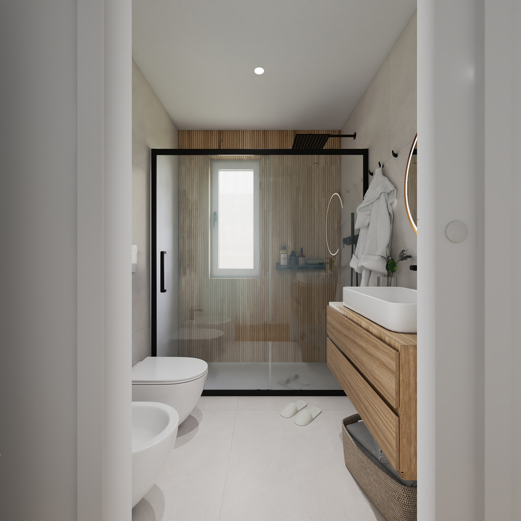 Verr consegnato nella versione Prime con gress porcellanato effetto legno di Atlas concorde, come i rivestimenti del bagno con effetto pietra/legno.