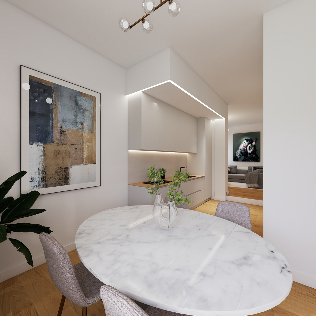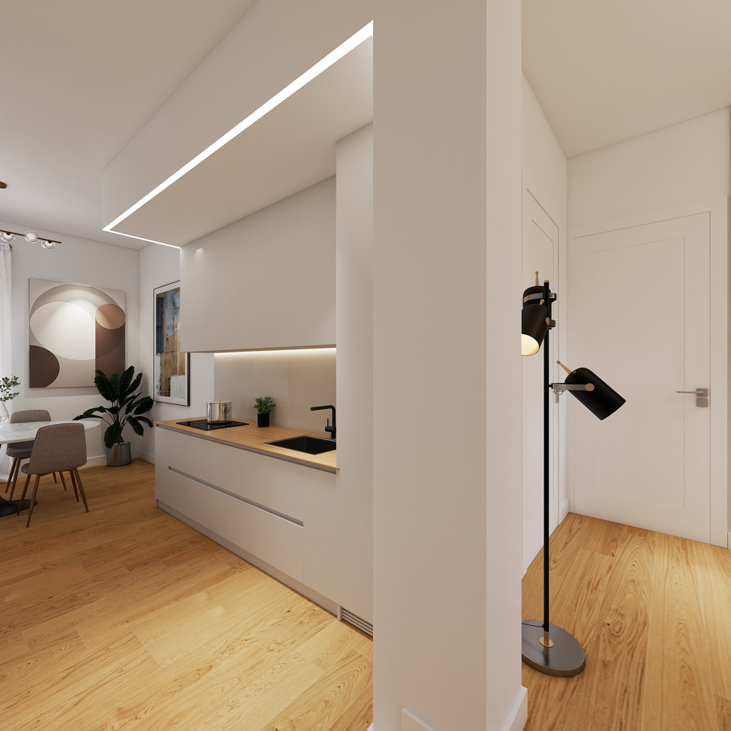 La zona giorno verr illuminata con tagli di luce a led ed il battiscopa sar di colore bianco.