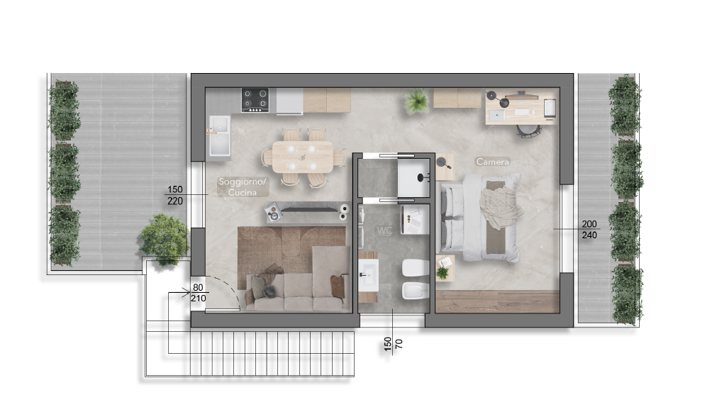 Lappartamento, bilocale al primo piano con entrata indipendente, è composto da: vano deposito sotto la scala, ingresso su luminoso soggiorno con cucina a vista, valorizzato da unampia vetrata con accesso al terrazzo abitabile bagno finestrato con antibagno spaziosa camera matrimoniale Il contesto è tranquillo e ben collegato: la spiaggia, la pineta di Pinarella, il centro e il porto di Cervia, le saline e la stazione ferroviaria sono facilmente raggiungibili anche in bicicletta.