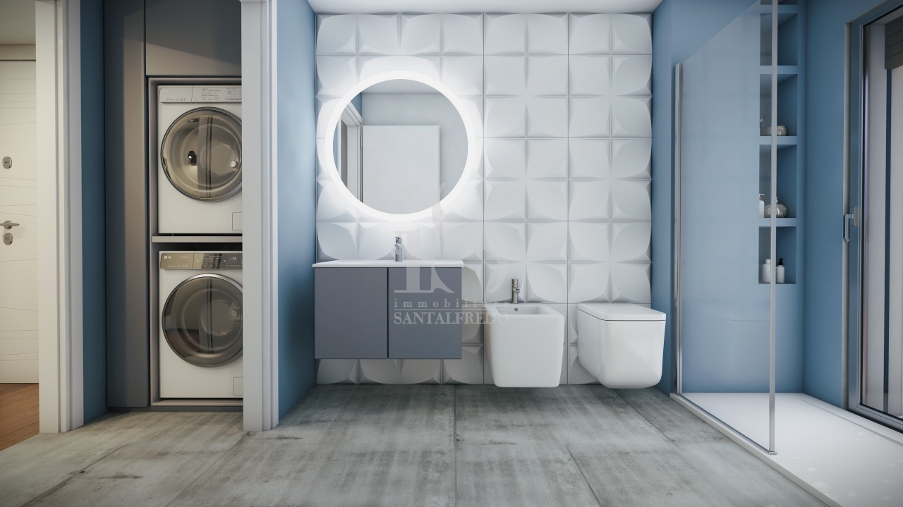 Il bagno, adiacente alla zona giorno, è previsto con sanitari Hatria modello Bianca, piatto doccia in resina effetto pietra, rubinetteria Ideal Standard Ceraline e scaldasalviette Zehnder.