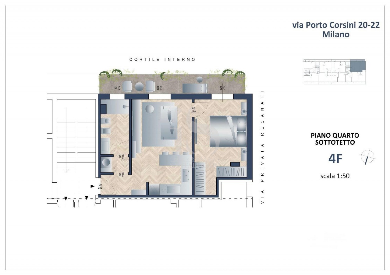 La zona giorno affaccia sul cortile interno attraverso un fronte continuo di aperture, con accesso diretto alla balconata, rifinita con pavimentazione strutturata antiscivolo.
