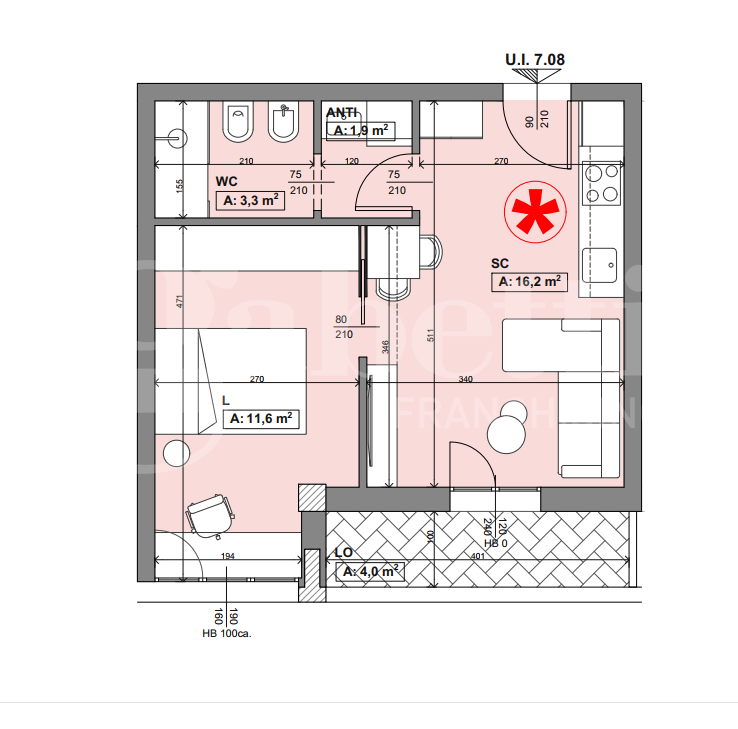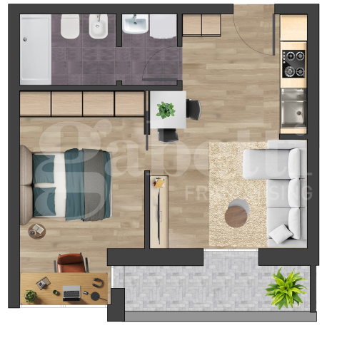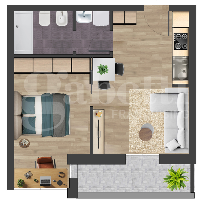 UNITA' 8 accogliente bilocale composto da ingresso su luminoso salotto con angolo cottura, terrazzo di 5 mq camera matrimoniale e bagno con antibagno.