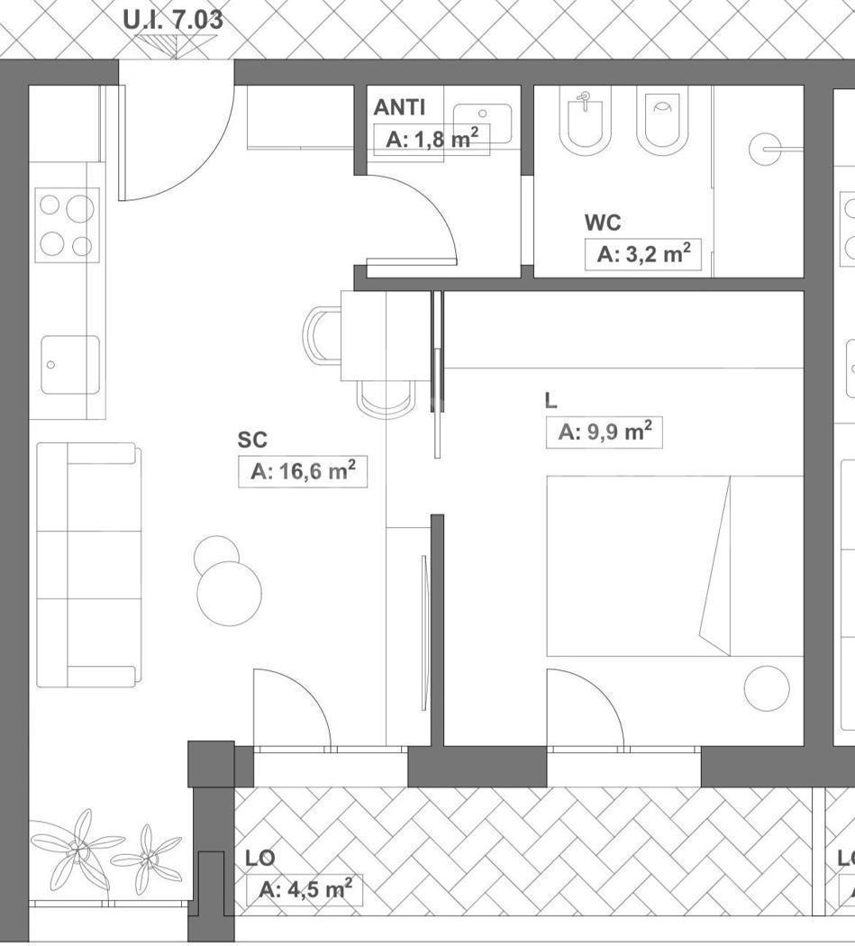 UNITA' 3 accogliente bilocale composto da ingresso su luminoso salotto con angolo cottura, terrazzo 4,5 mq camera matrimoniale e bagno con antibagno.