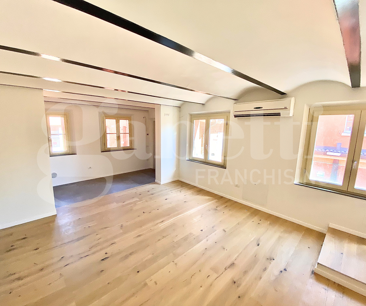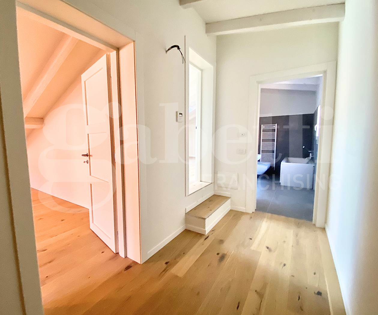 Un disimpegno conduce alla camera matrimoniale, al bagno principale e a un ampio ripostiglio, illuminato da due velux, elemento raro e particolarmente utile per questa tipologia.