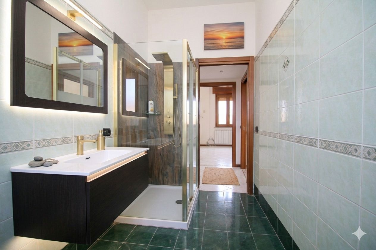L'ingresso sul disimpegno dal quale si raggiungono la grande cucina abitabile di 18mq., il soggiorno, il bagno con doccia, l'accesso della camera da letto dal soggiorno.