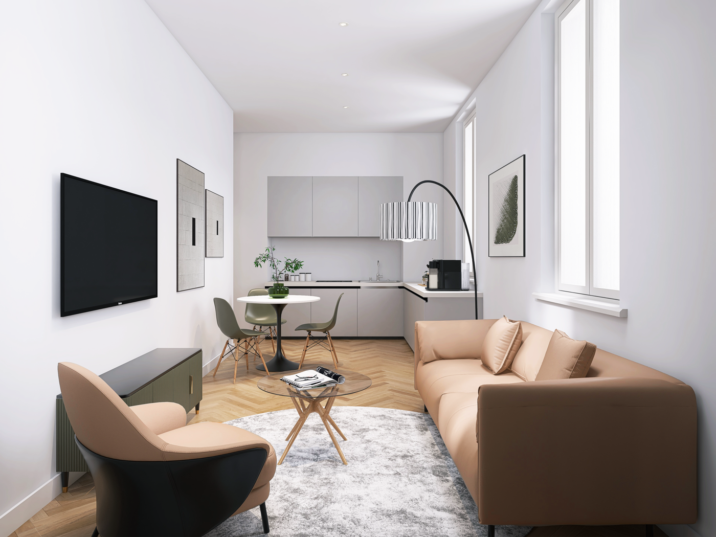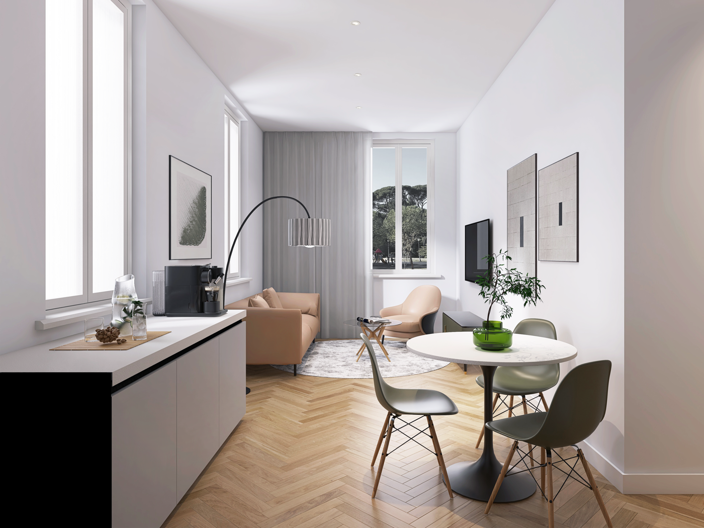 Entrando troveremo, lungo il corridoio dingresso, una comoda zona lavanderia ed un servizio; proseguendo, la soluzione si aprir su un luminoso soggiorno con angolo cottura e con doppia esposizione che avr vista sullo splendido parco di Villa Massimo.