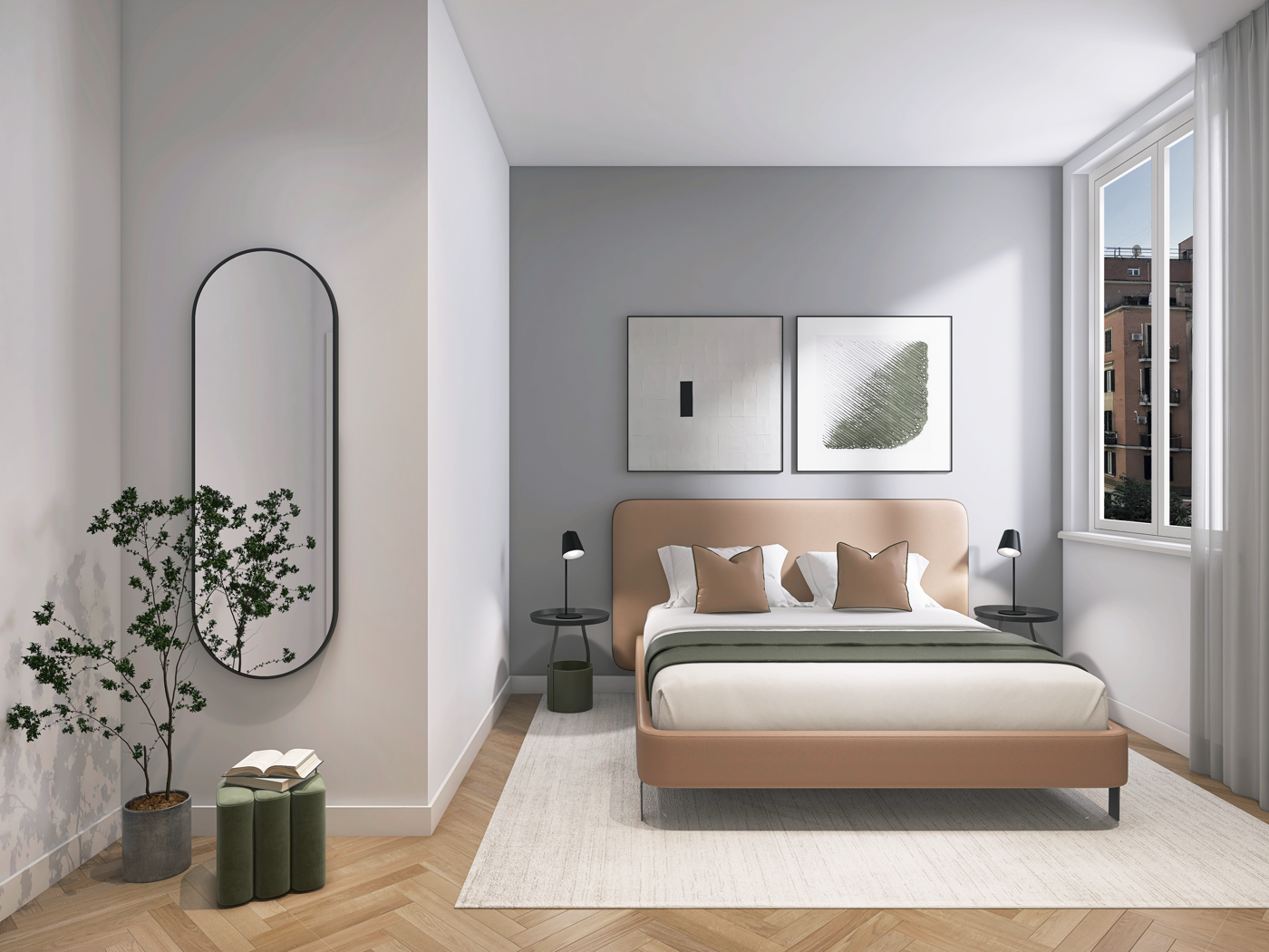 Troveremo sulla parte sinistra della soluzione unampia camera con affaccio sul verde.