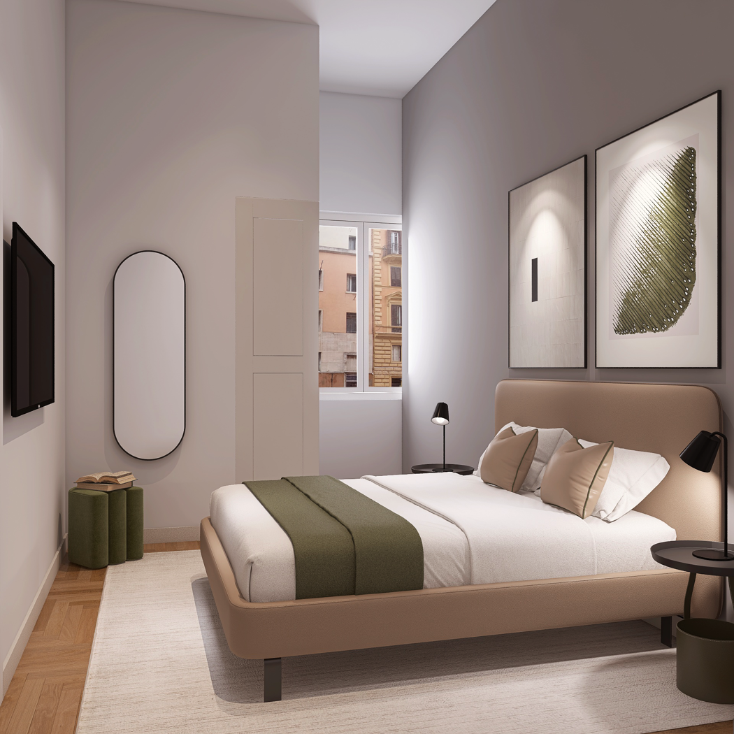 Troveremo poi, sulla parte destra della soluzione, un luminoso soggiorno con angolo cottura e una spaziosa camera matrimoniale, entrambi con affaccio esterno su Via Toscana; sulla parte sinistra sar presente un bagno finestrato.