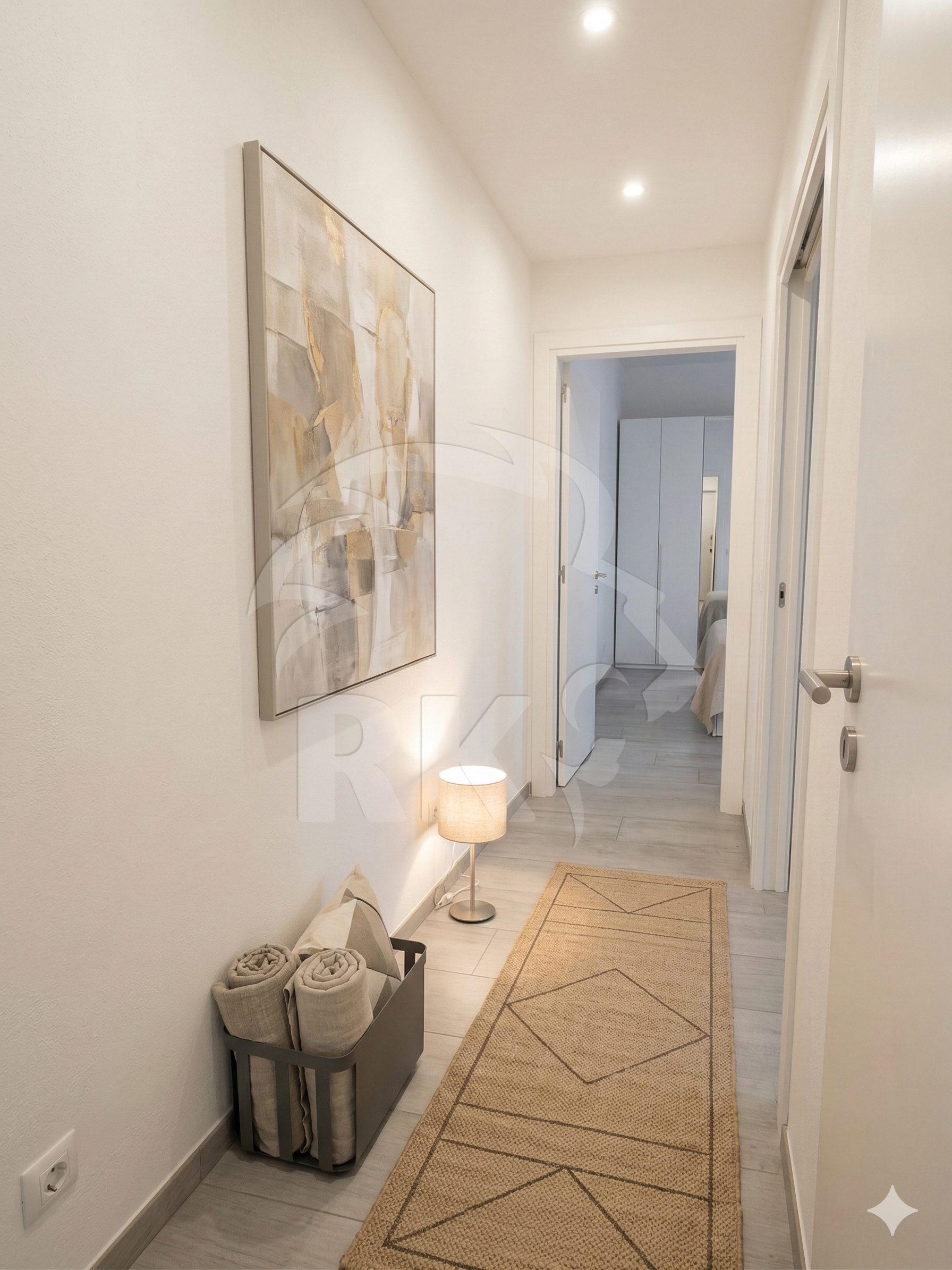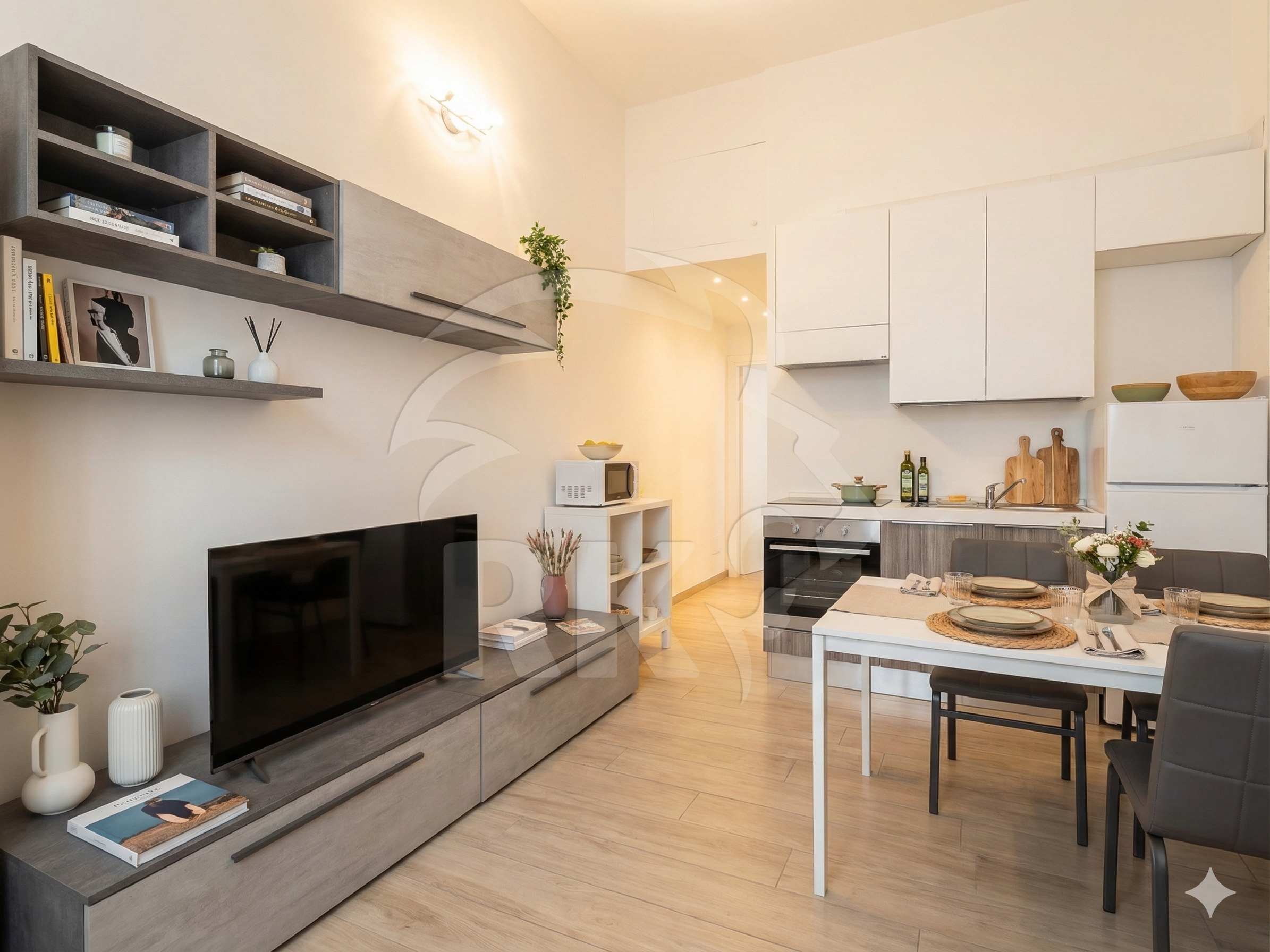 L'abitazione dispone di un ingresso indipendente che conduce direttamente alla zona giorno, composta da un soggiorno con angolo cottura a vista.