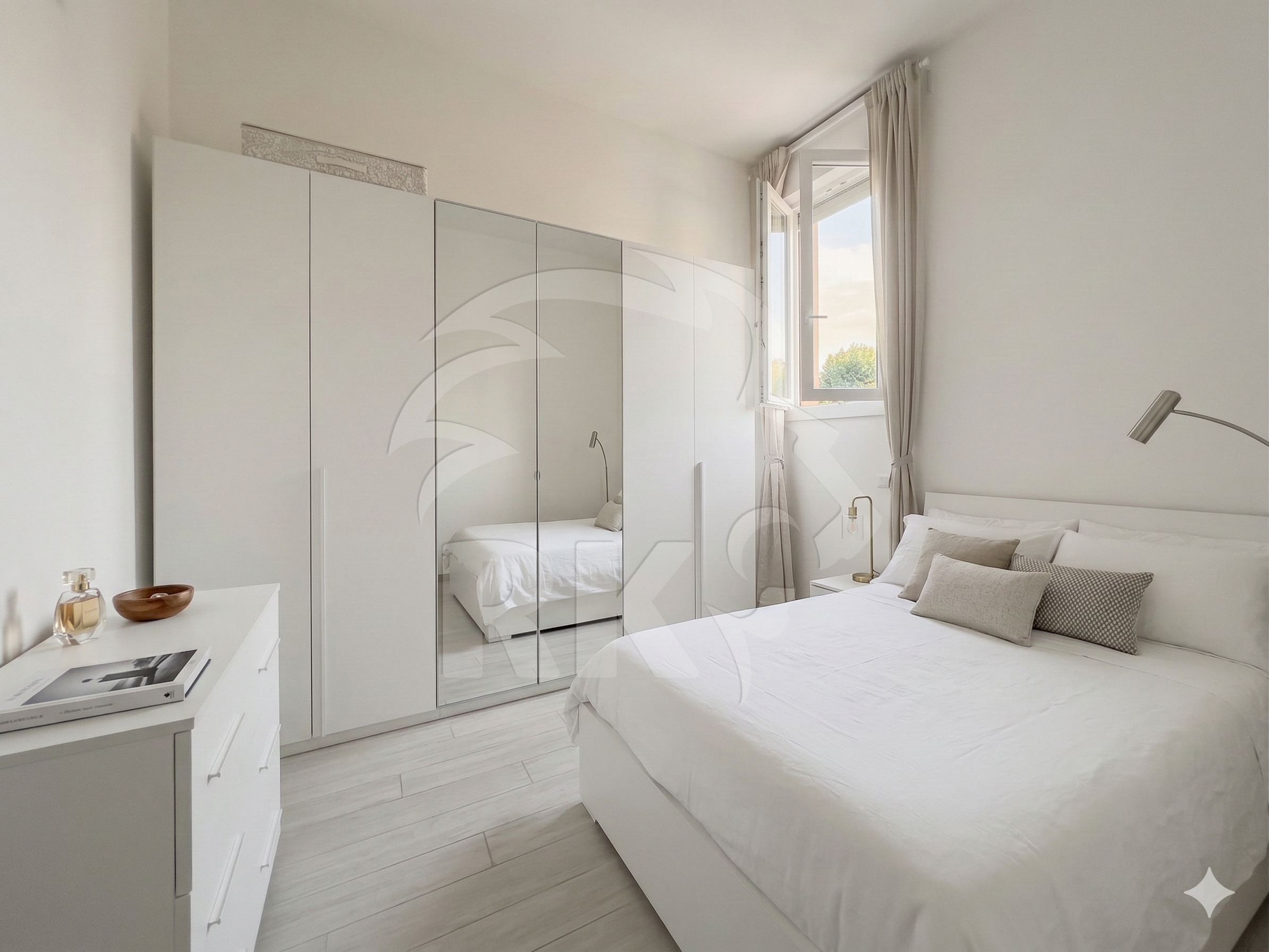 La zona notte comprende una confortevole camera da letto matrimoniale e un ampio bagno finestrato, caratteristica di pregio per questa tipologia di appartamento.
