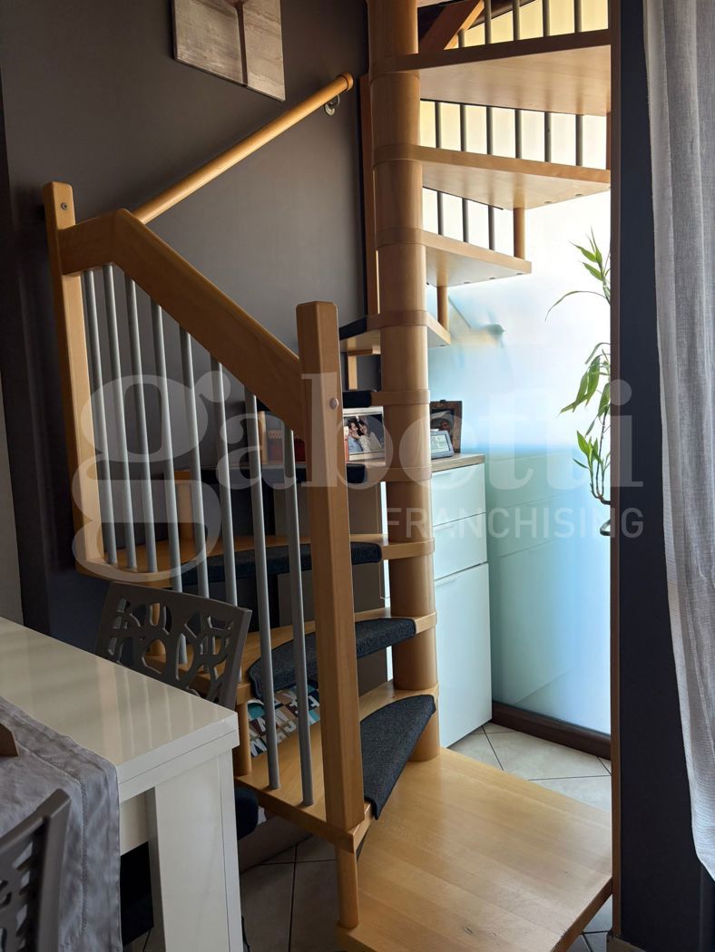 Una scala a chiocciola rifinita collega il soggiorno al locale tecnico posto al piano superiore, attualmente adibito a studio/zona relax.
