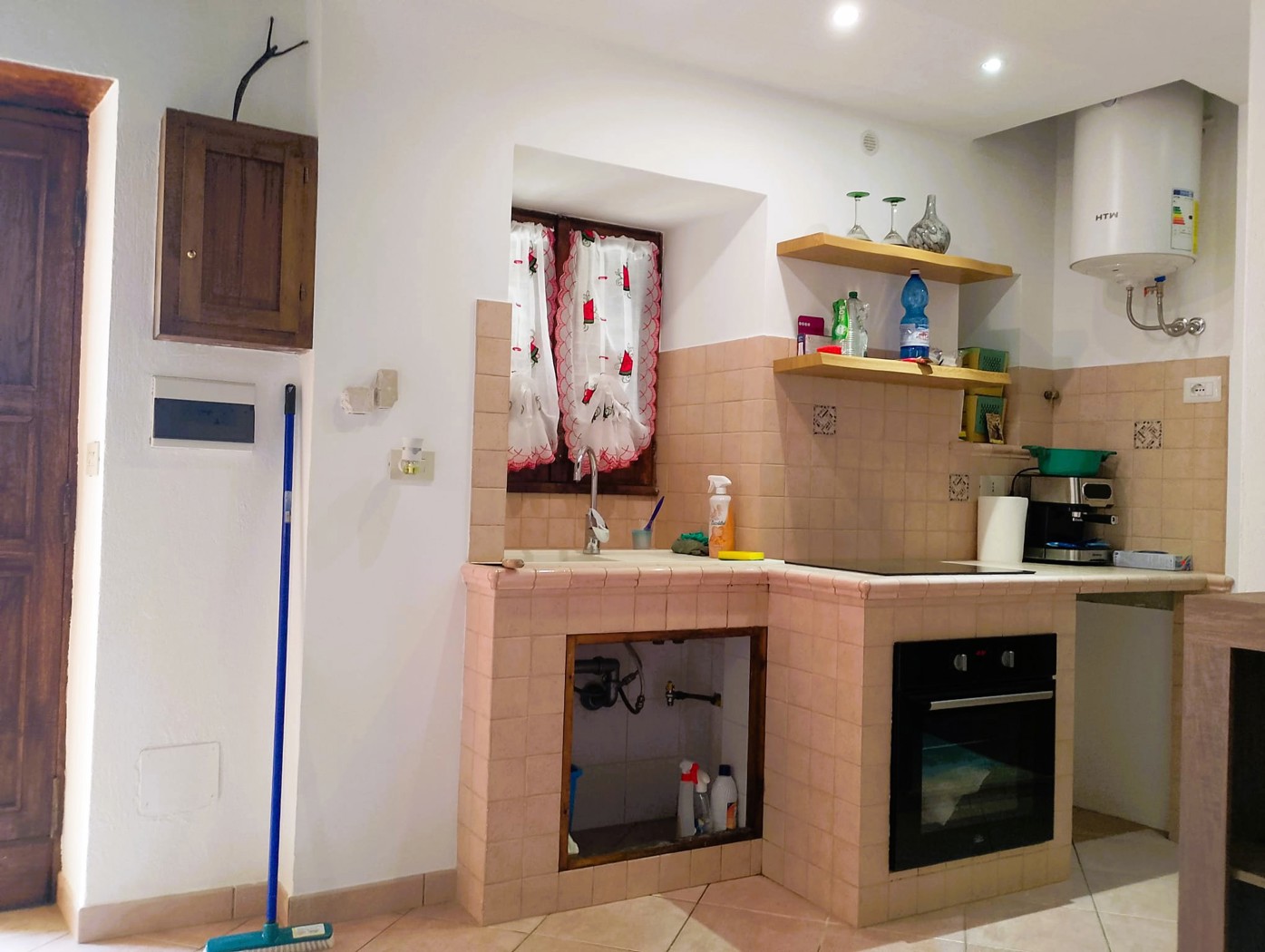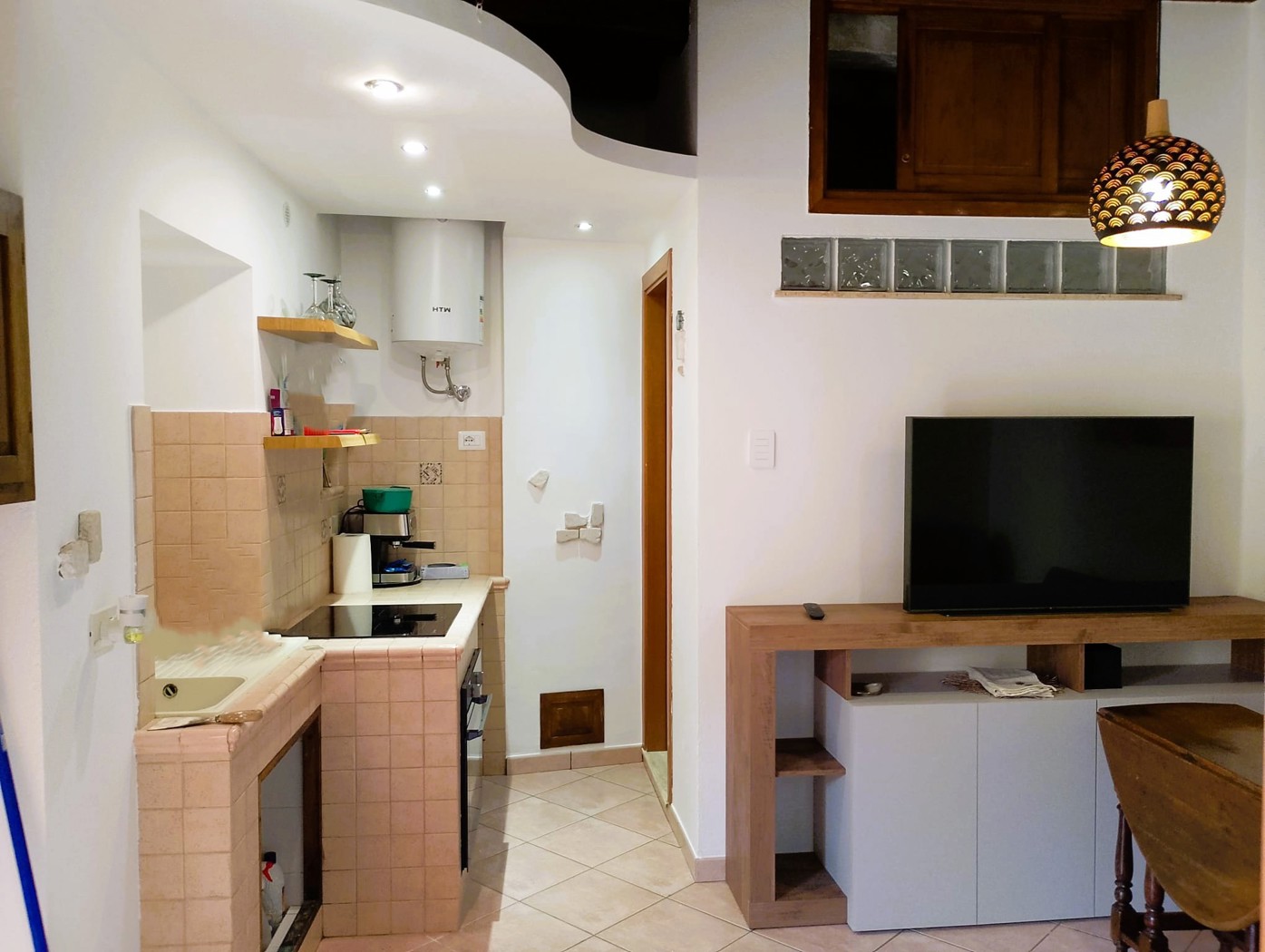 Ingresso nel soggiorno con angolo cottura, camera matrimoniale e bagno.