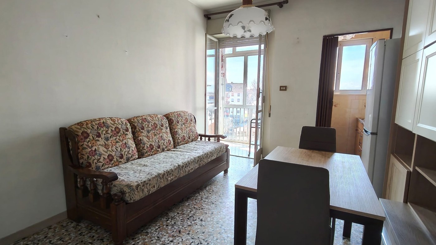 L'appartamento si presenta abitabile sin da subito ed cos composto: dal portoncino di ingresso si accede al disimpegno che separa tutti gli ambienti, a sinistra vi la zona giorno con tinello con cucinino ed uscita sul primo balcone verandato dotato di attacchi per la lavatrice; a destra vi la camera da letto matrimoniale, con uscita sul secondo balcone.
