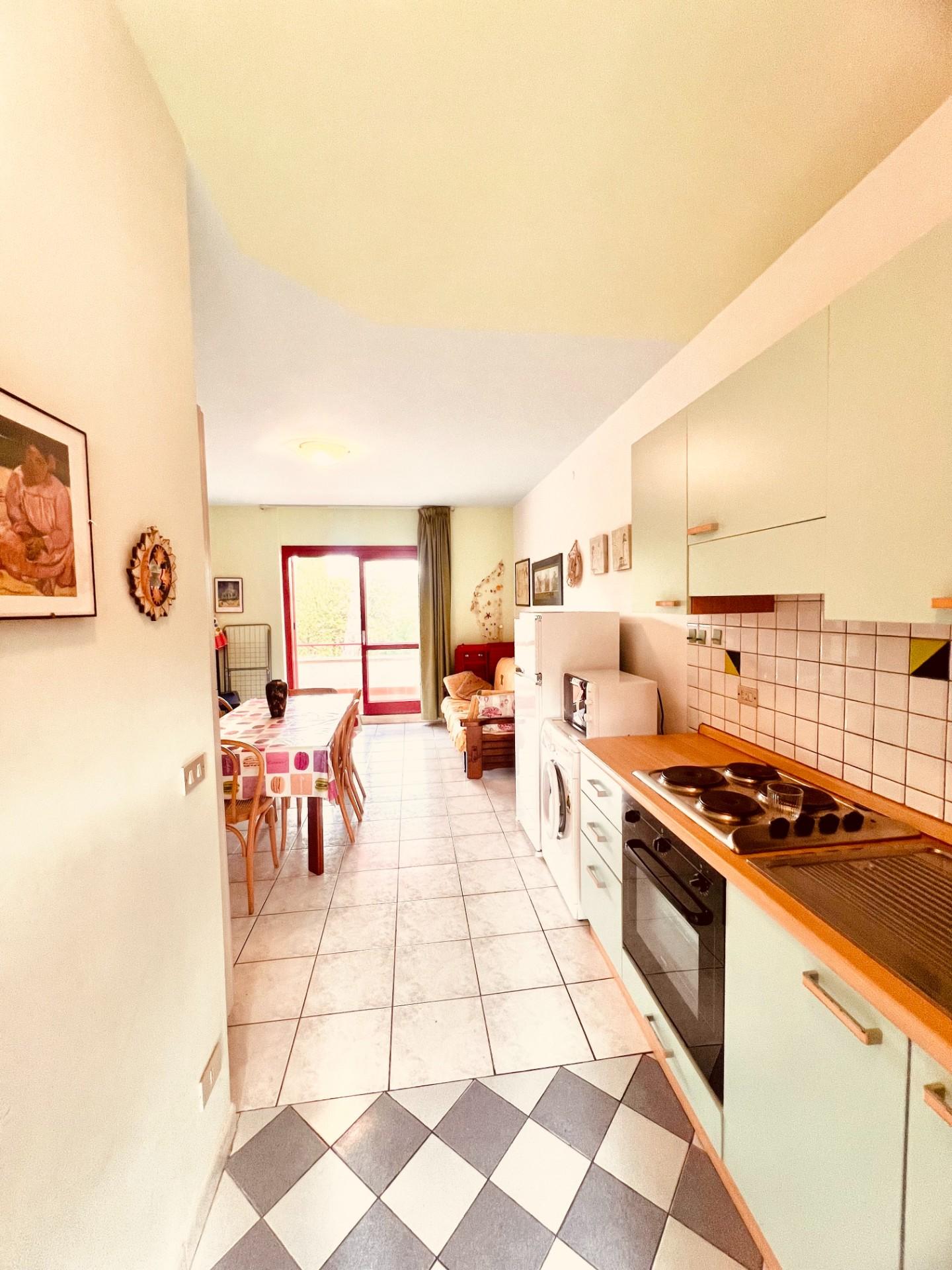 Lappartamento si compone di una cucina con zona giorno che si affaccia su una veranda esterna, una camera matrimoniale e un bagno finestrato con doccia.