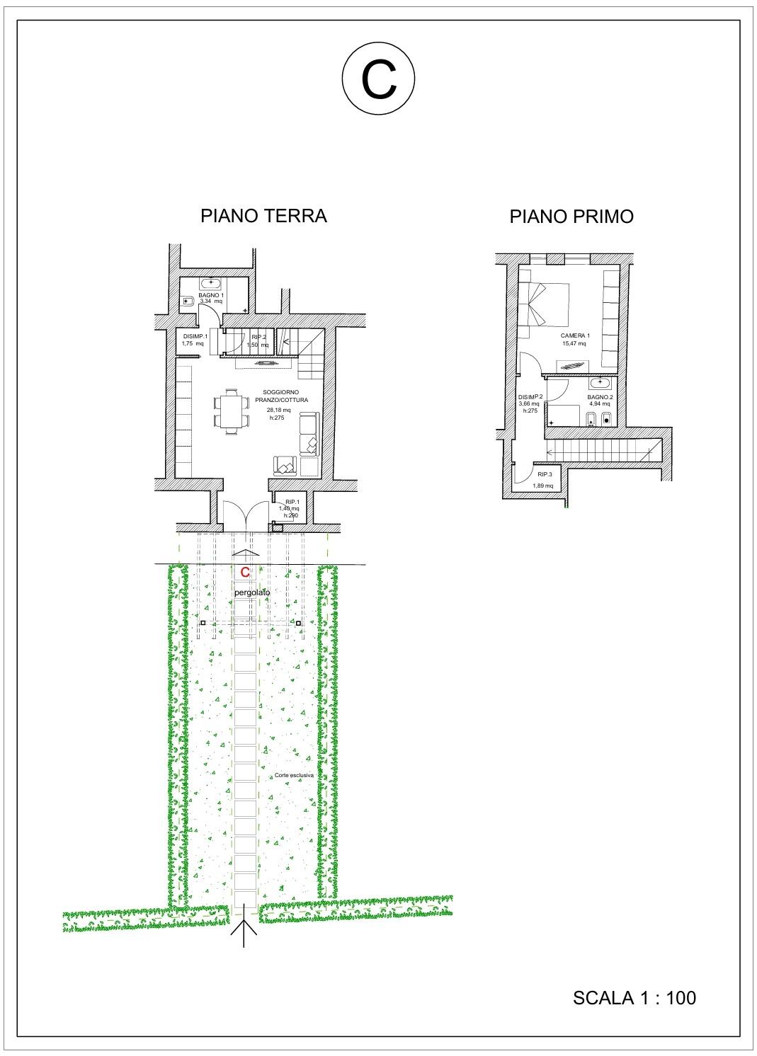 Al piano terra troviamo il soggiorno con angolo cottura, un ripostiglio e un bagno, attraverso una comoda scala si accede al piano superiore dove troviamo una camera matrimoniale, un ripostiglio ed un bagno.