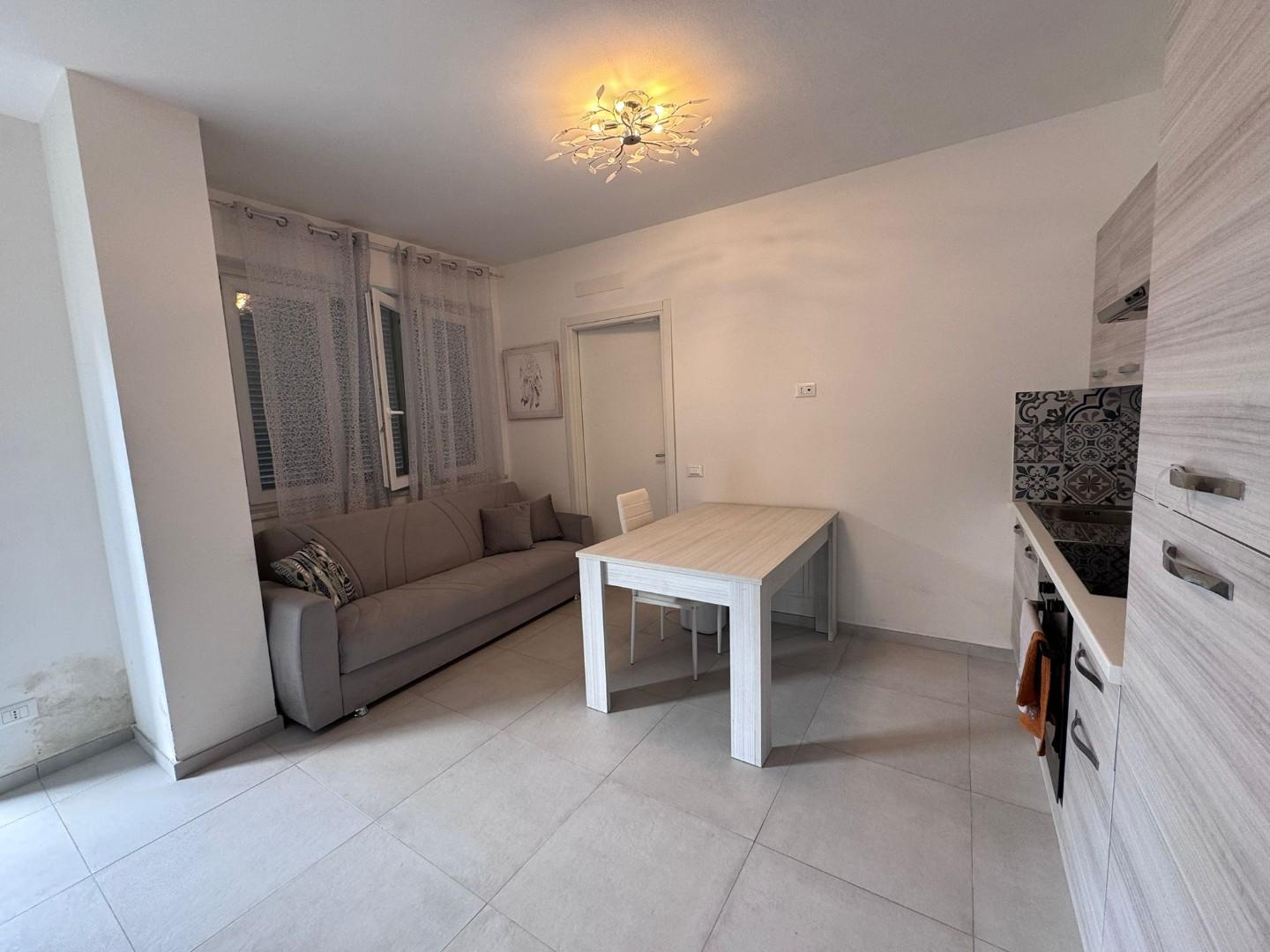 Bilocale al piano terra con piastrellato esterno di proprietà composto da: ingresso ampio su soggiorno con cucina a vista, camera matrimoniale e bagno.