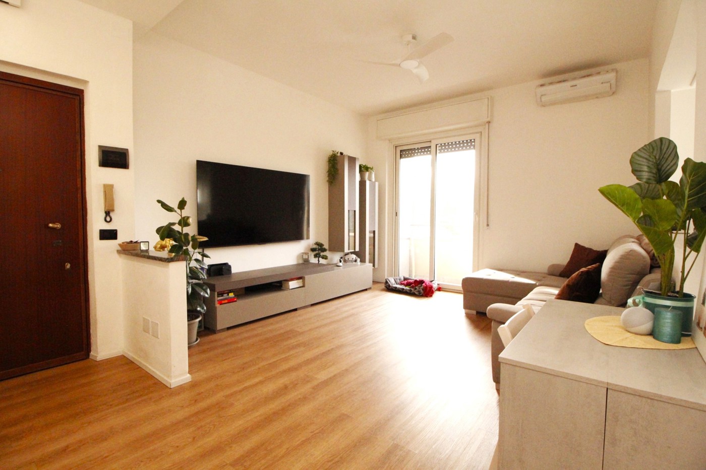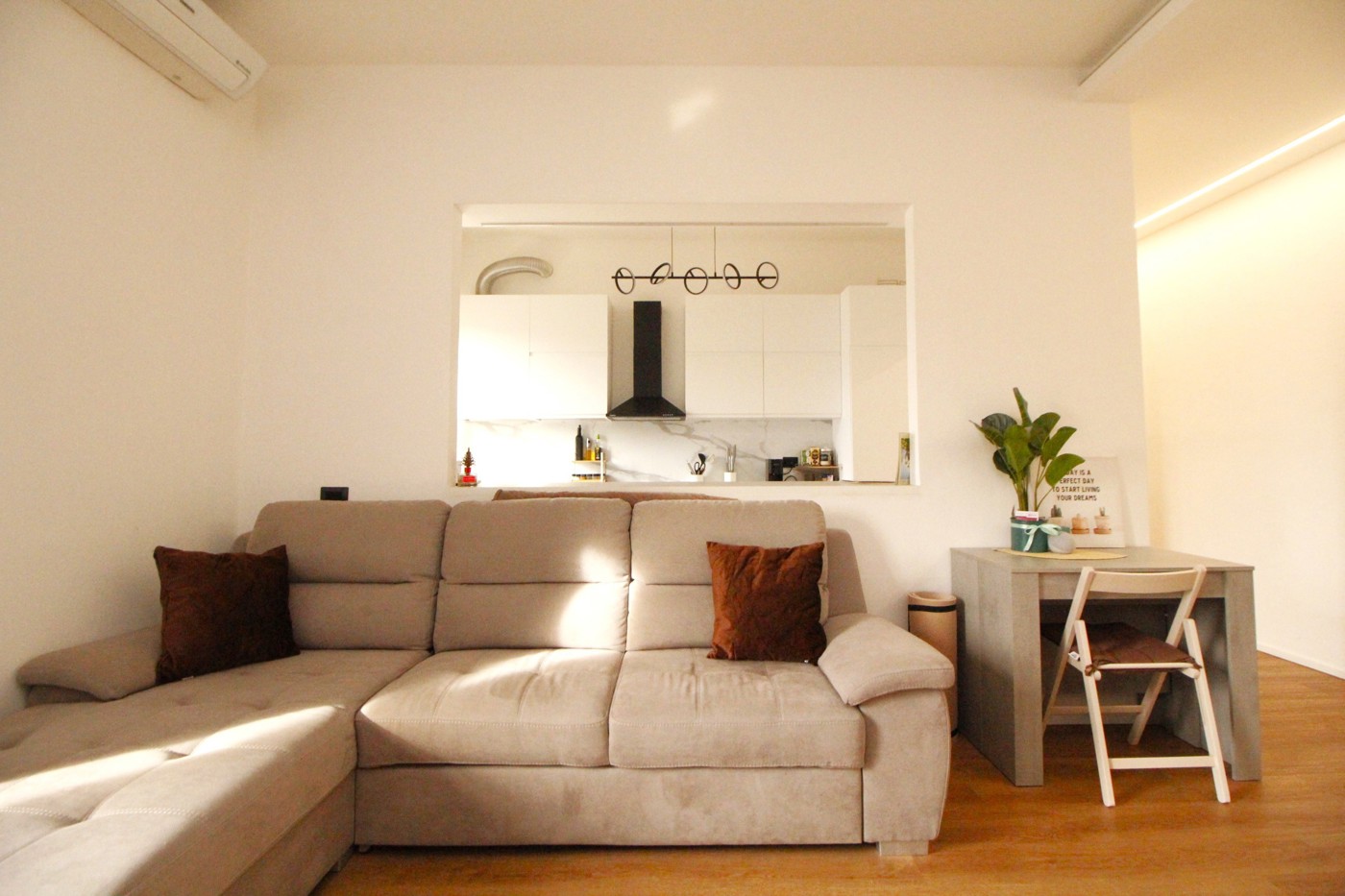 Lingresso si apre su unaccogliente zona living affiancata da una cucina abitabile, entrambe servite da balcone, ideale per godersi momenti di relax allaria aperta.