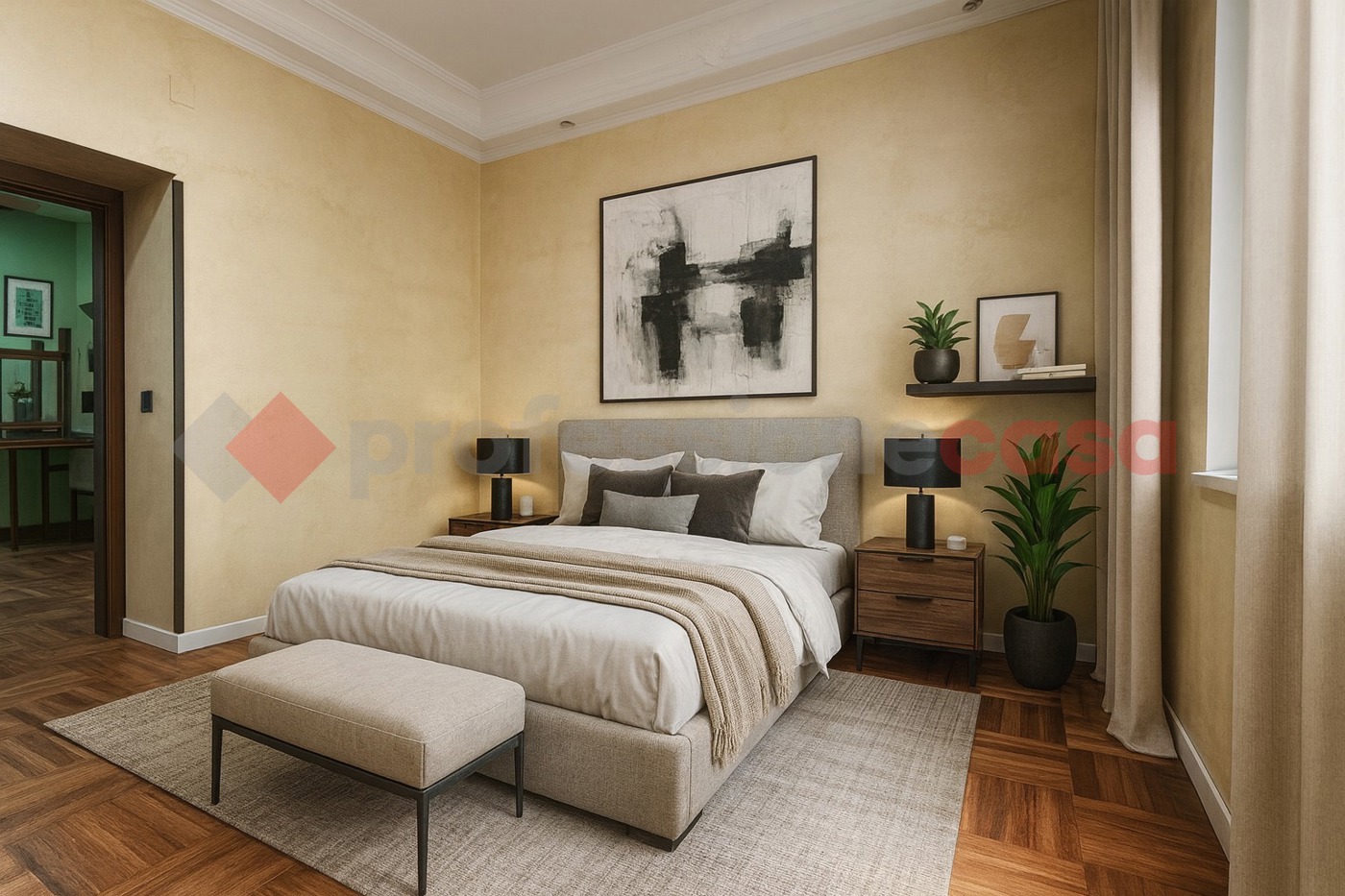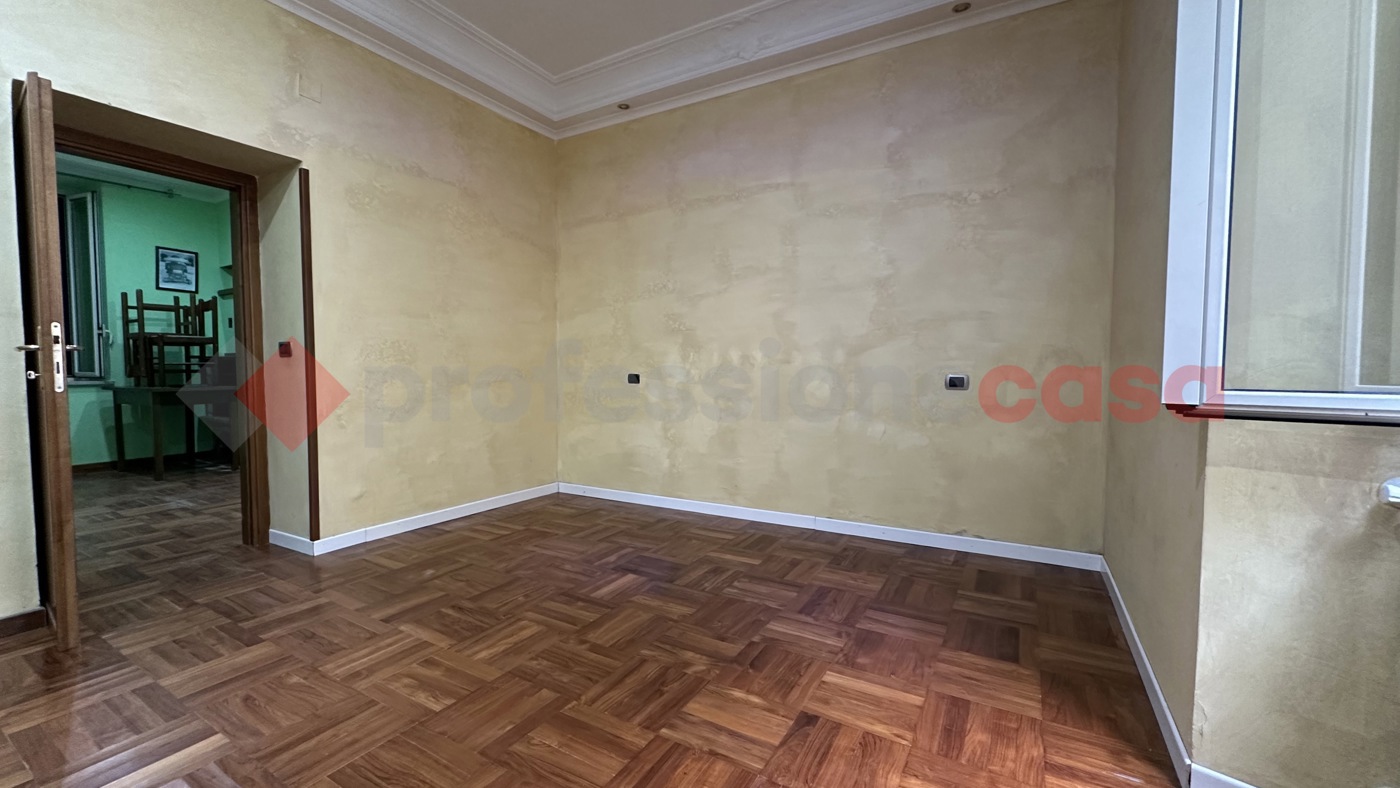 La pavimentazione in parquet a quadrotte, i soffitti sono impreziositi da cornici decorative in gesso e gli infissi sono nuovi in PVC/alluminio con doppio vetro.