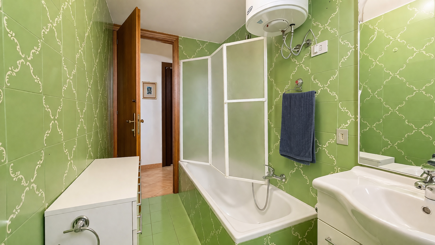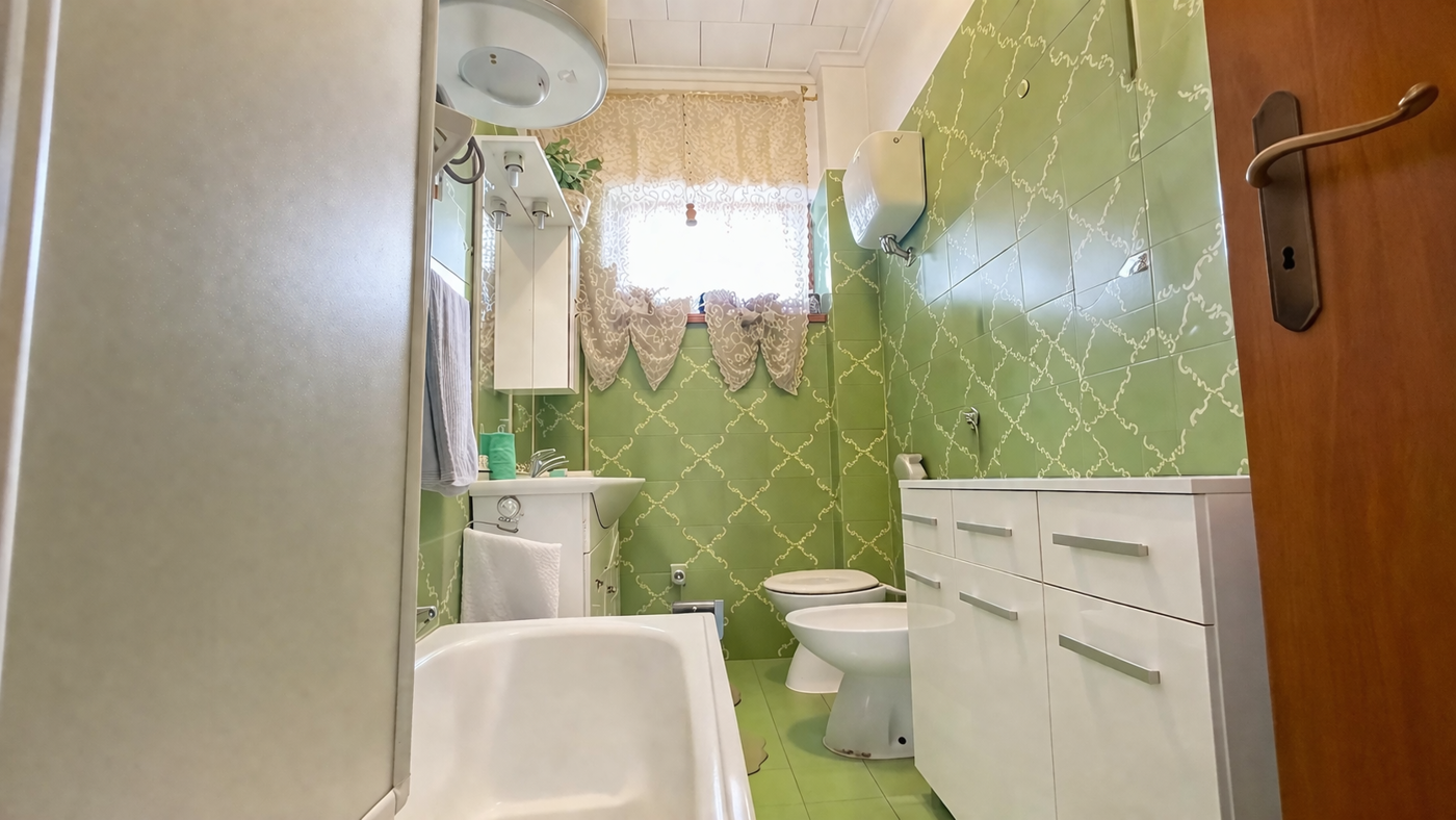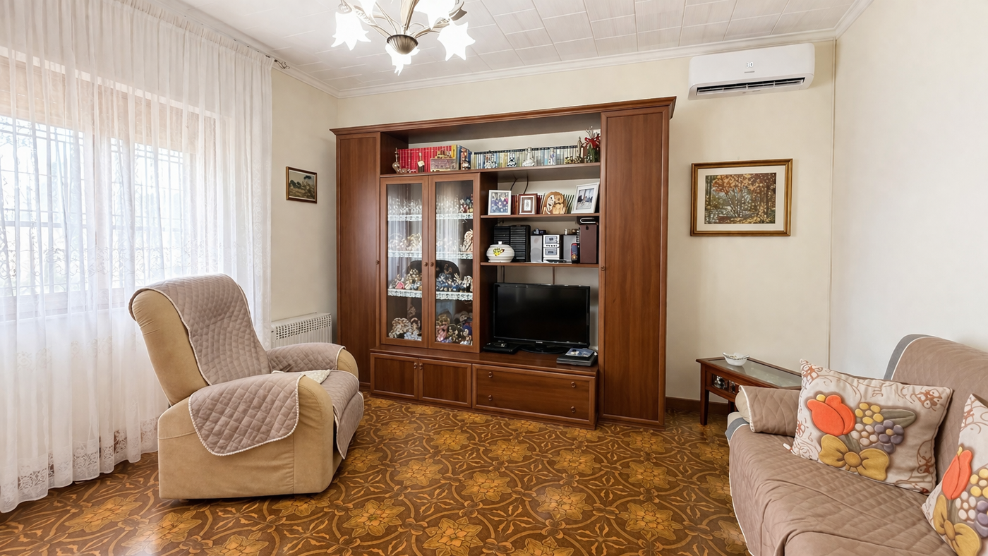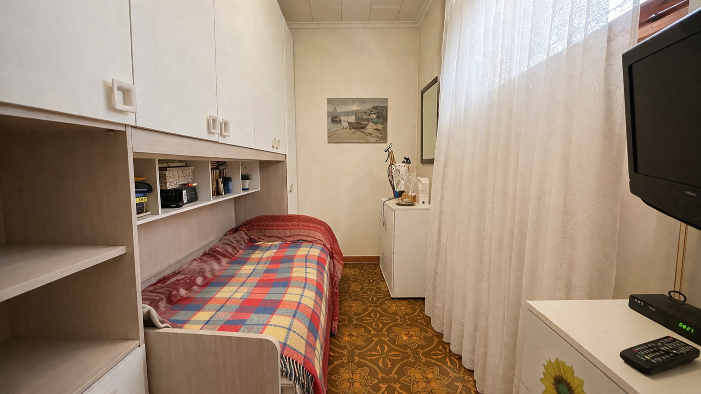 La zona giorno, luminosa e funzionale, stata organizzata in modo intelligente per ricavare una seconda cameretta singola attraverso una soluzione pratica e discreta, ideale per ospiti o per chi desidera uno spazio aggiuntivo.