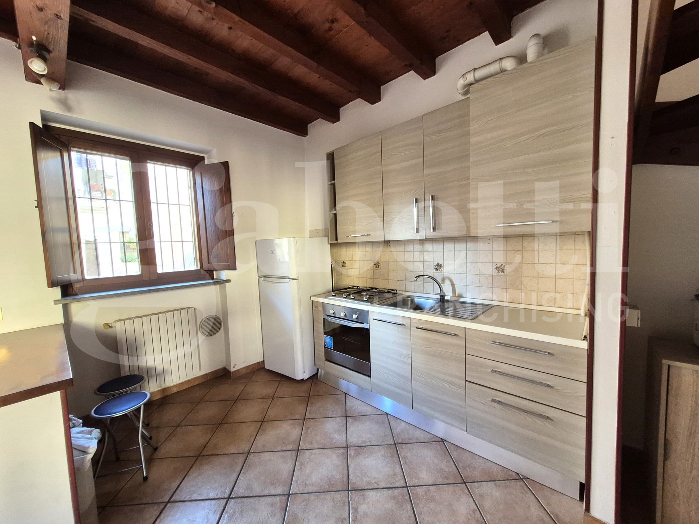 Lingresso conduce direttamente in una luminosa zona giorno con cucina a vista, valorizzata dai suggestivi soffitti con travi in legno che donano calore e carattere allambiente.
