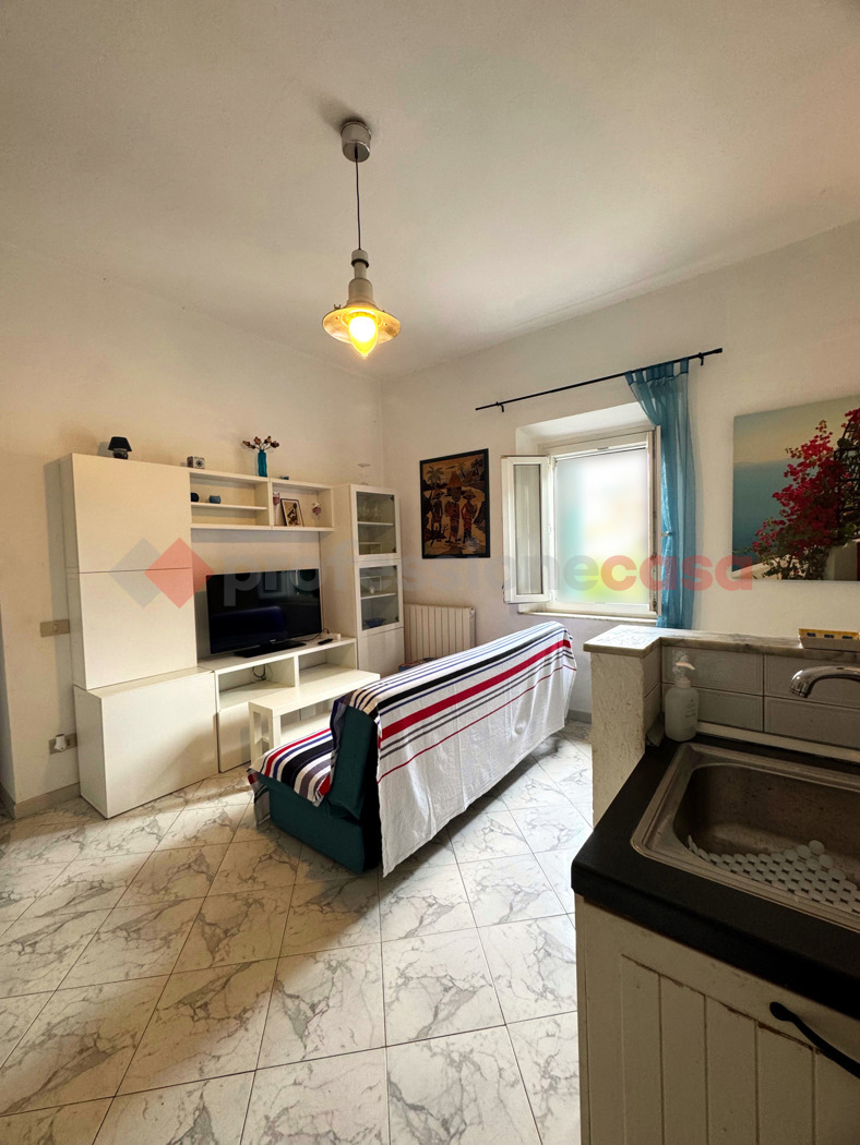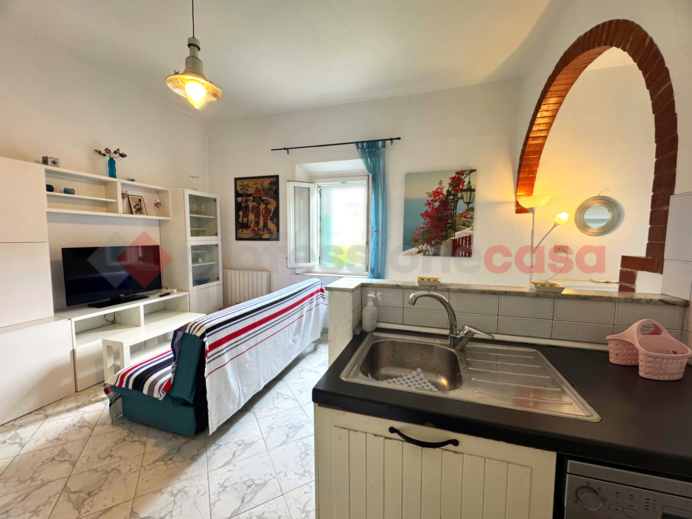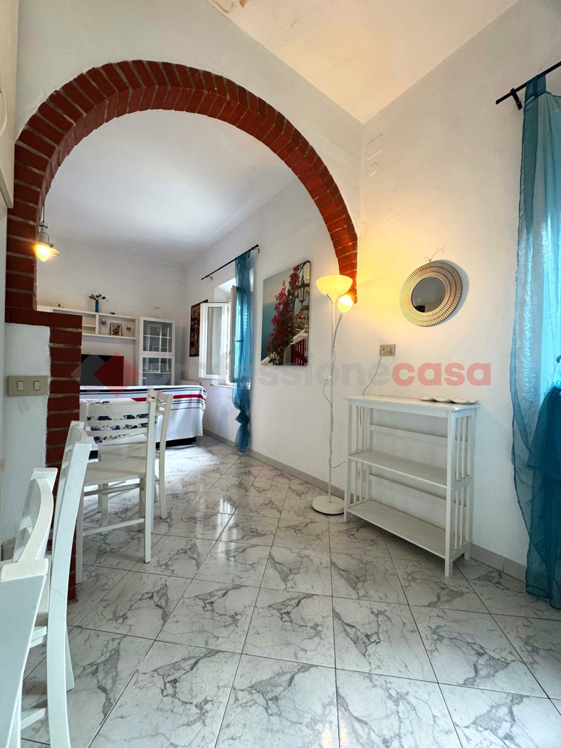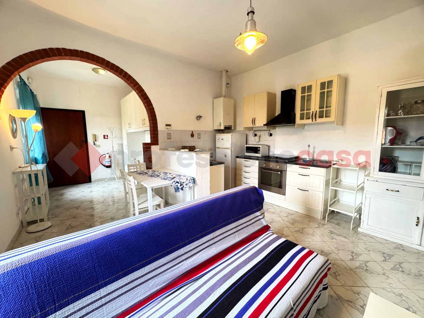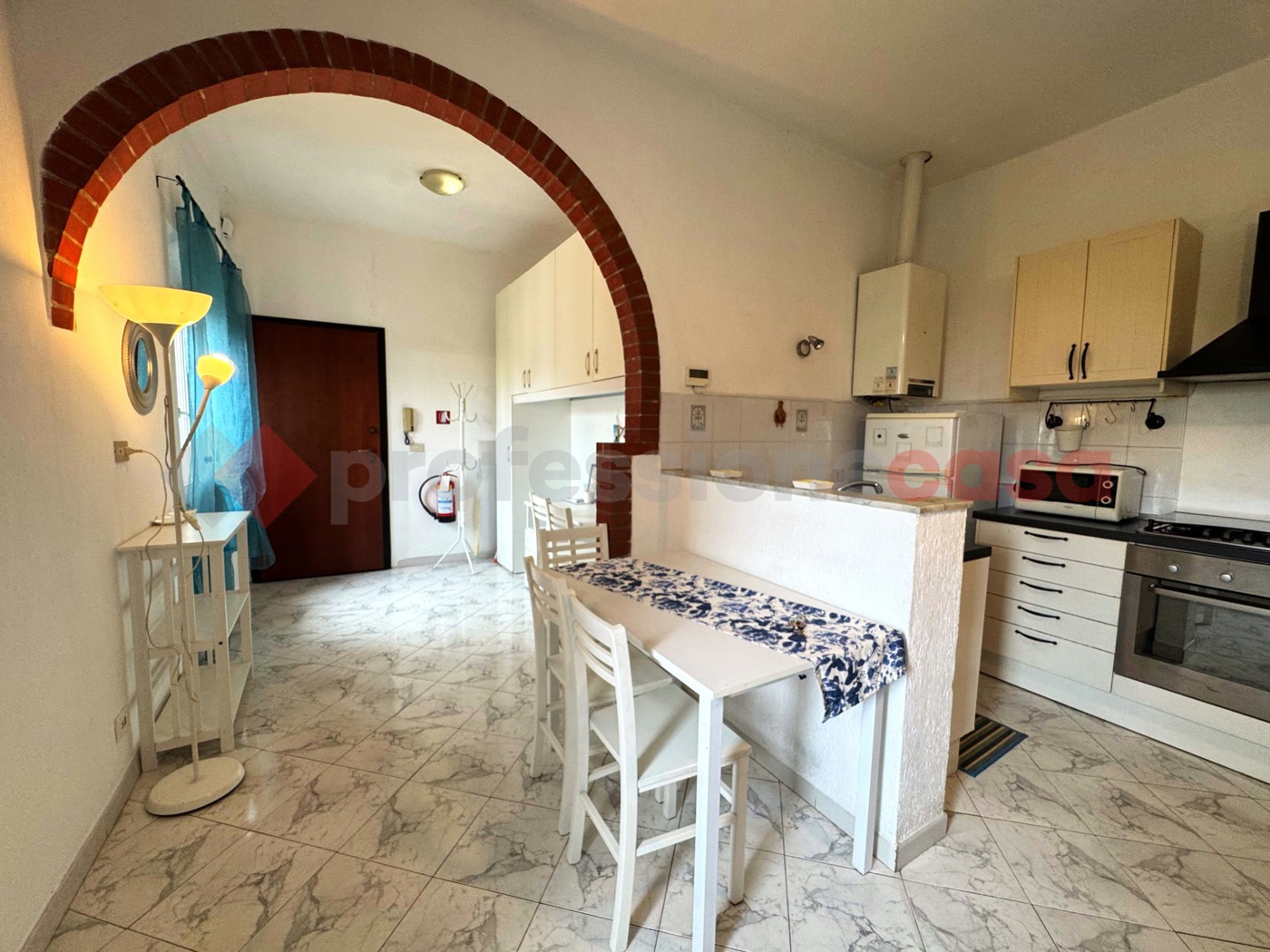 Limmobile si apre con un ampio ingresso, reso unico da un caratteristico arco in pietra che separa lingresso dalla zona giorno con angolo cottura, donando personalit e carattere allambiente.