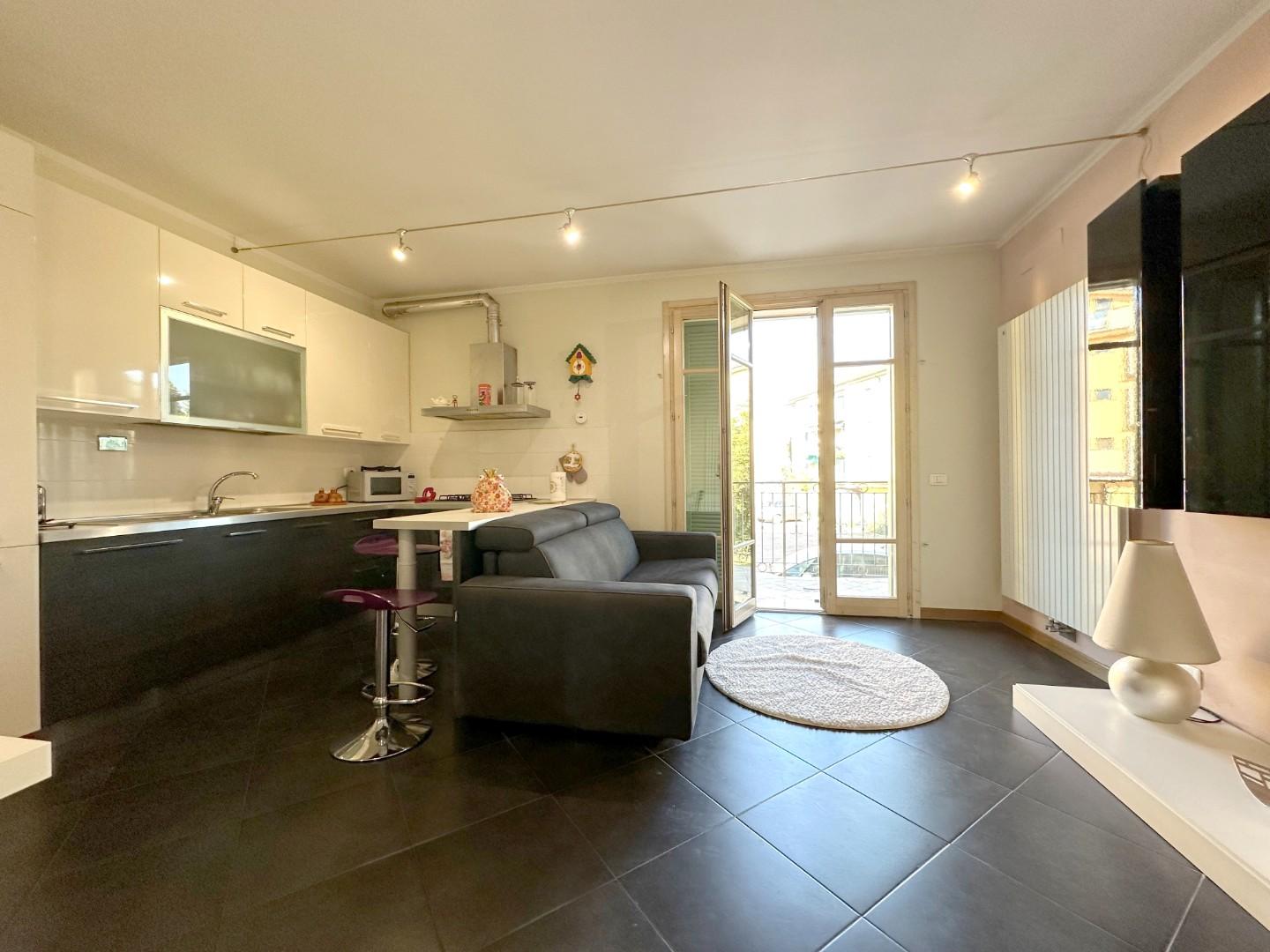 Lappartamento si apre su una piacevole zona living con cucina a vista e accesso al balcone.