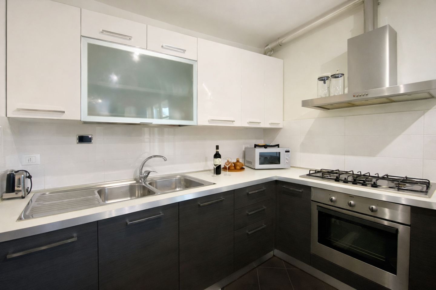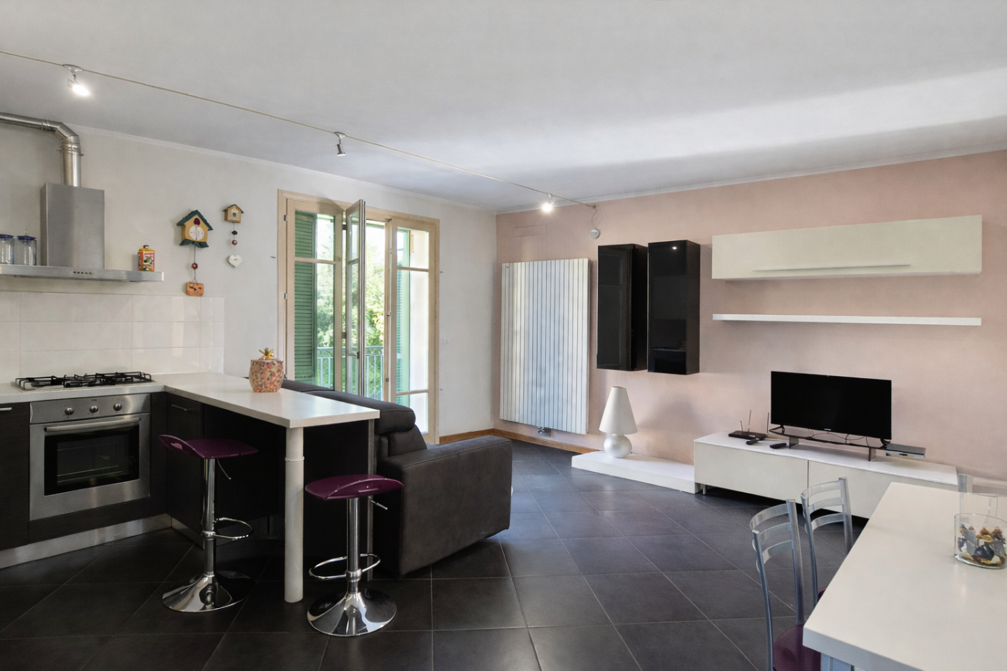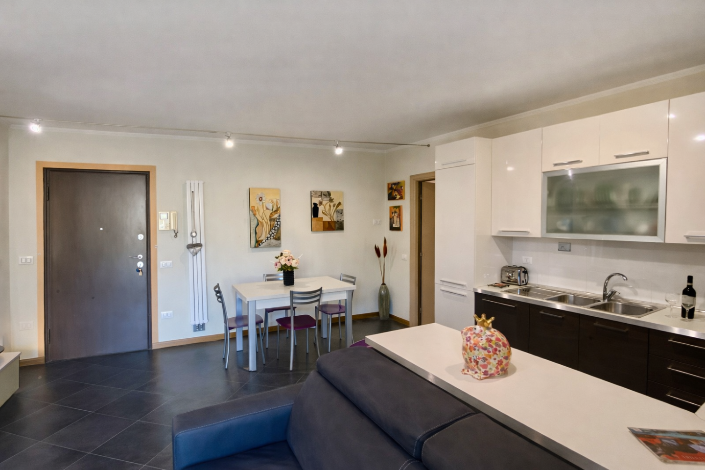 Le finiture sono contemporanee e curate: pavimentazione scura di design, cucina lineare ed elegante, arredi moderni che valorizzano lambiente.