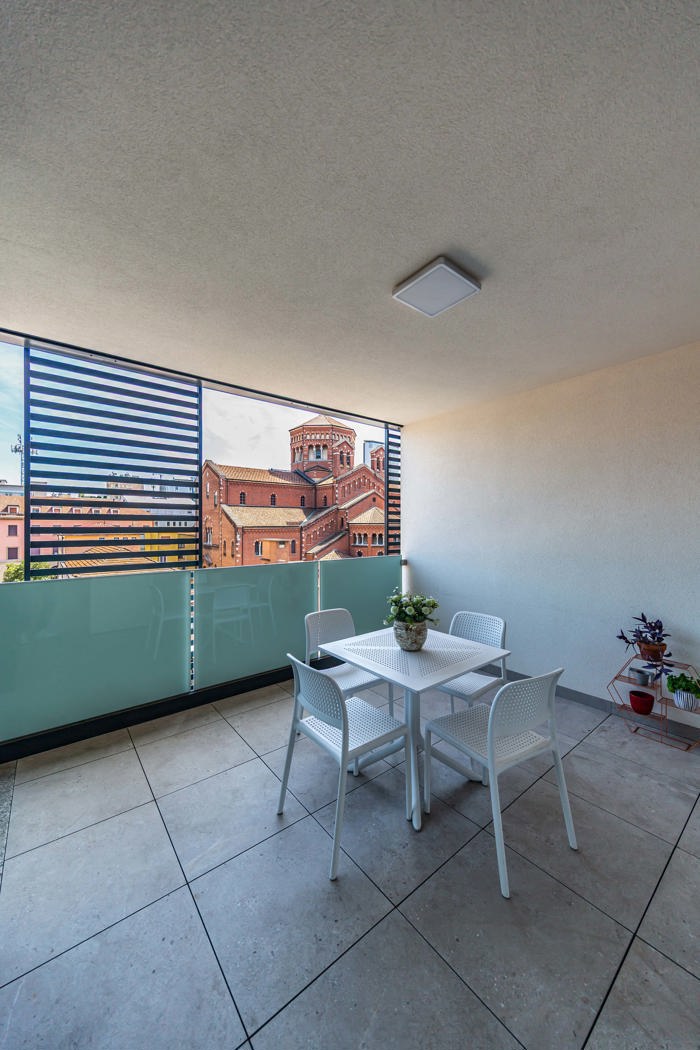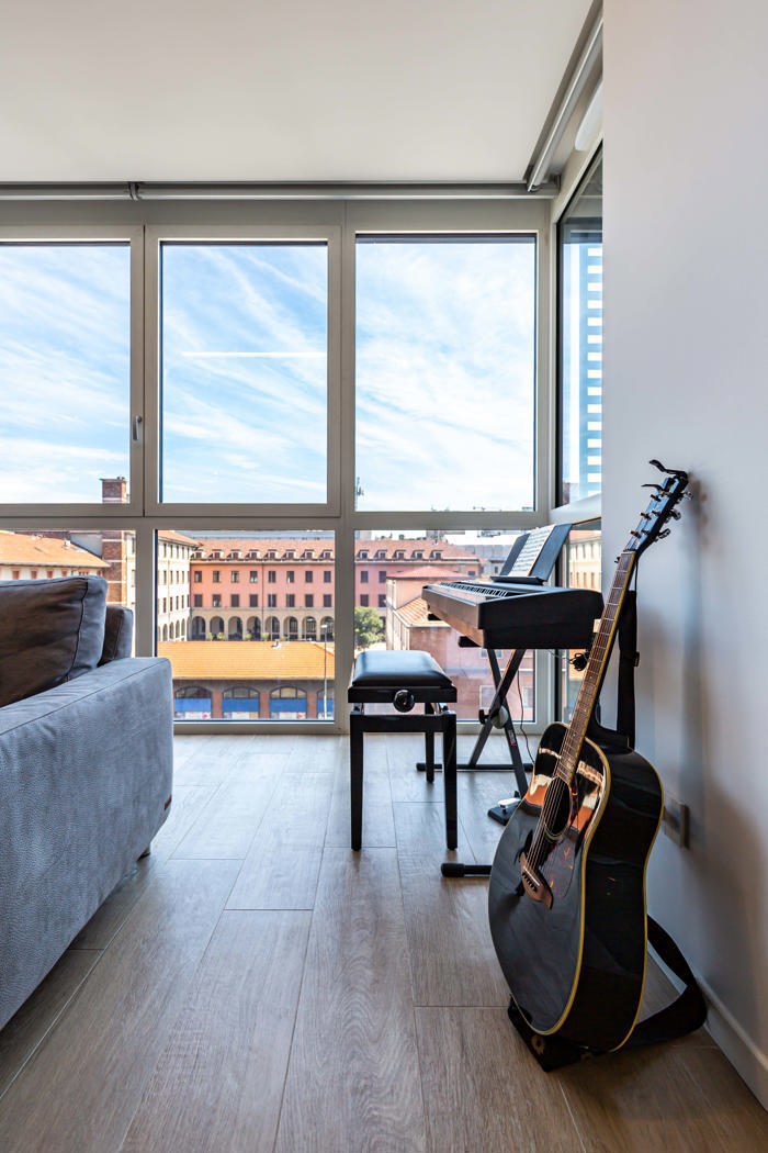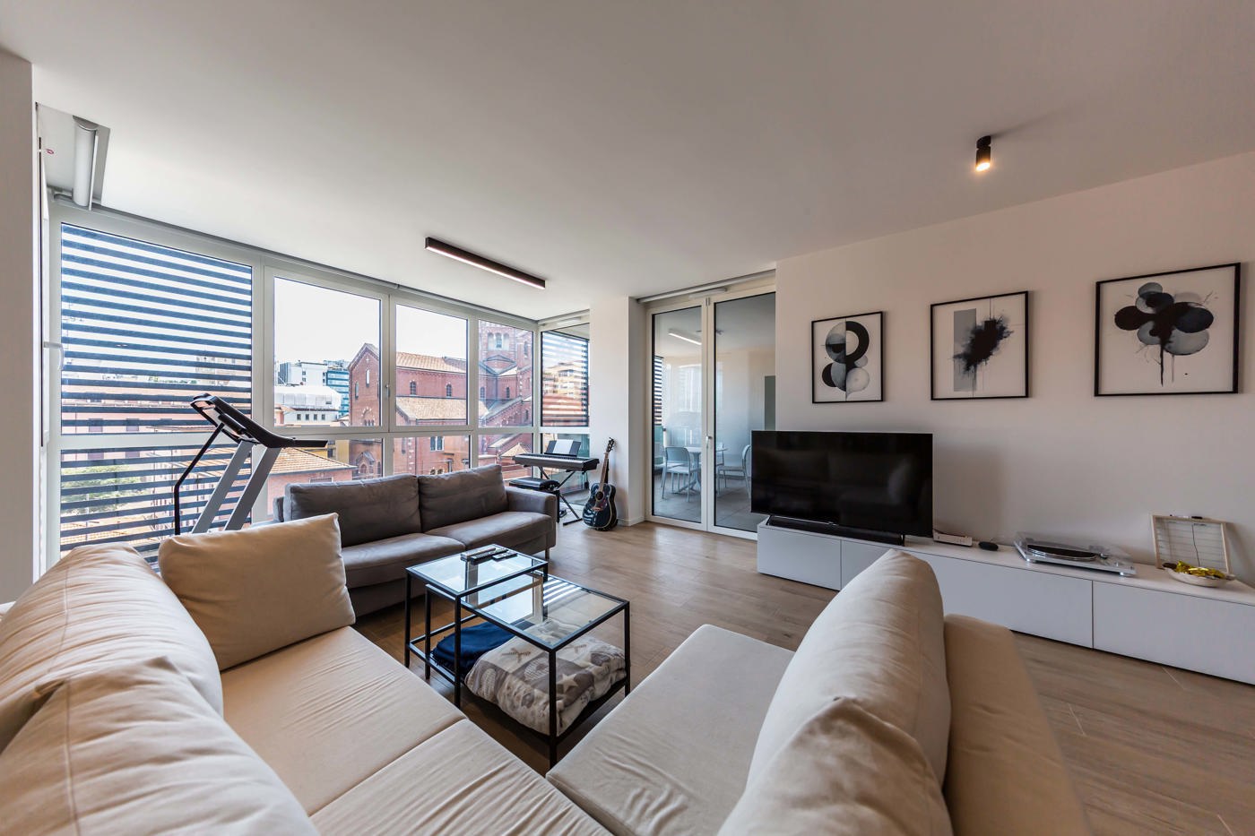 Ledificio si sviluppa su unaltezza di 9 piani e, pi da vicino, labitazione posta al piano quarto, ha una superficie commerciale di circa 85mq e si caratterizza per i panoramici affacci sulla Basilica di SantAgostino, le vetrate a tutta altezza e gli ampi e fruibili spazi esterni.