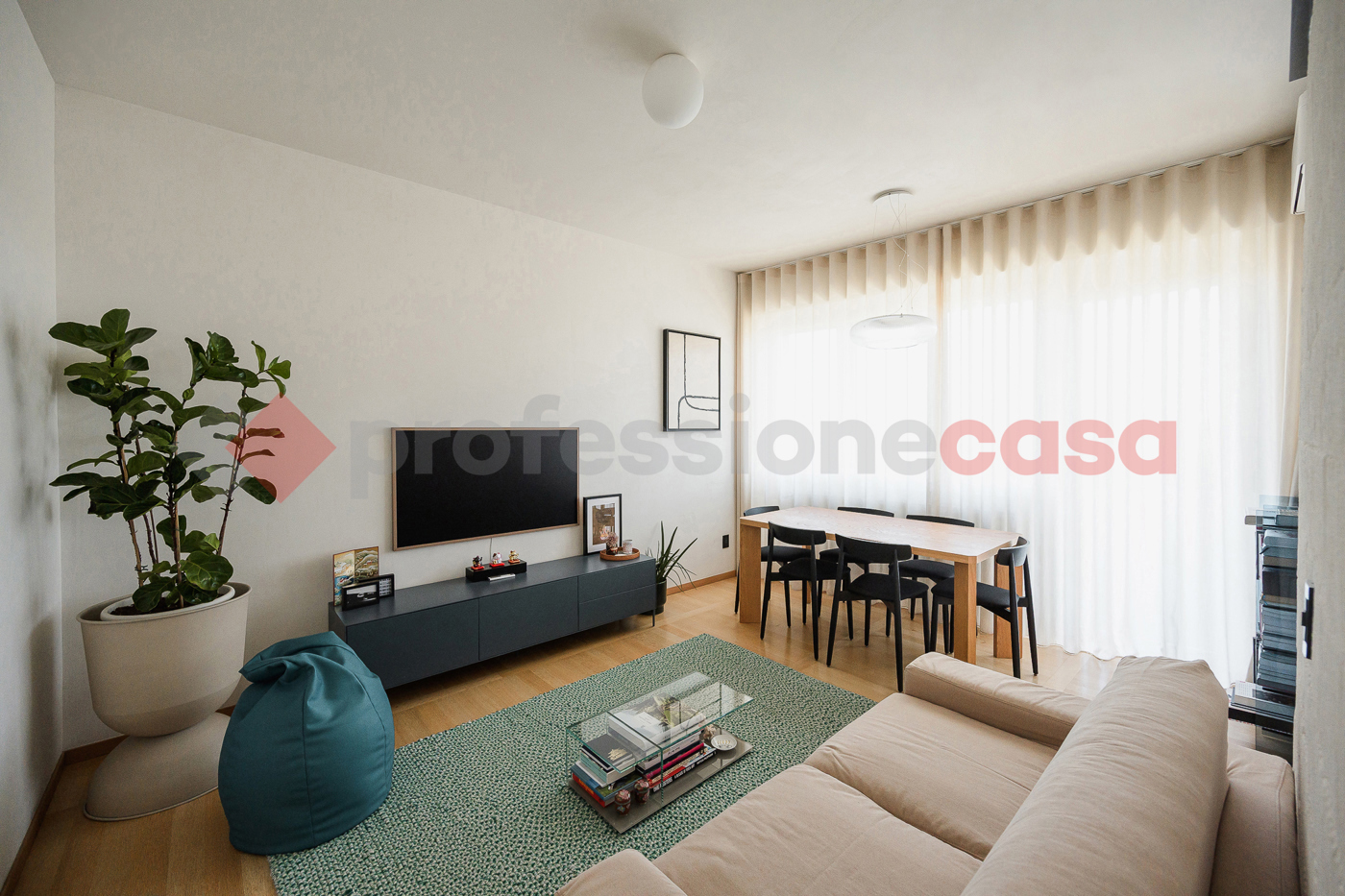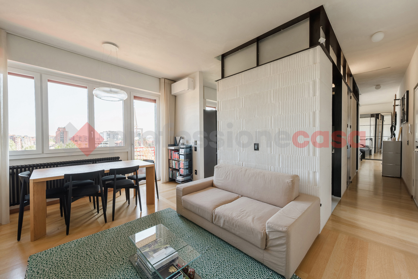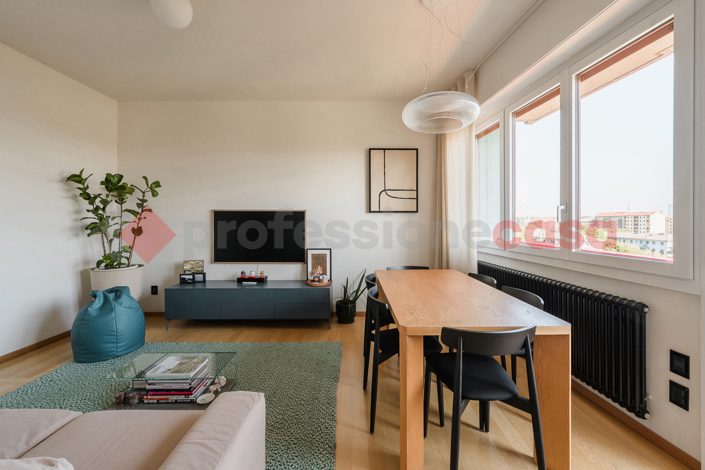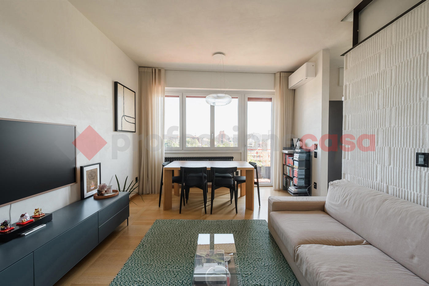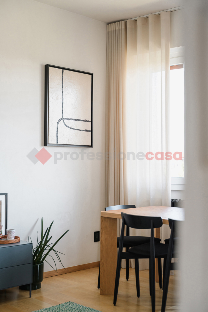 La zona living, luminosa e ariosa grazie alle ampie vetrate, si apre direttamente sul terrazzino, fondendo perfettamente gli spazi interni ed esterni.
