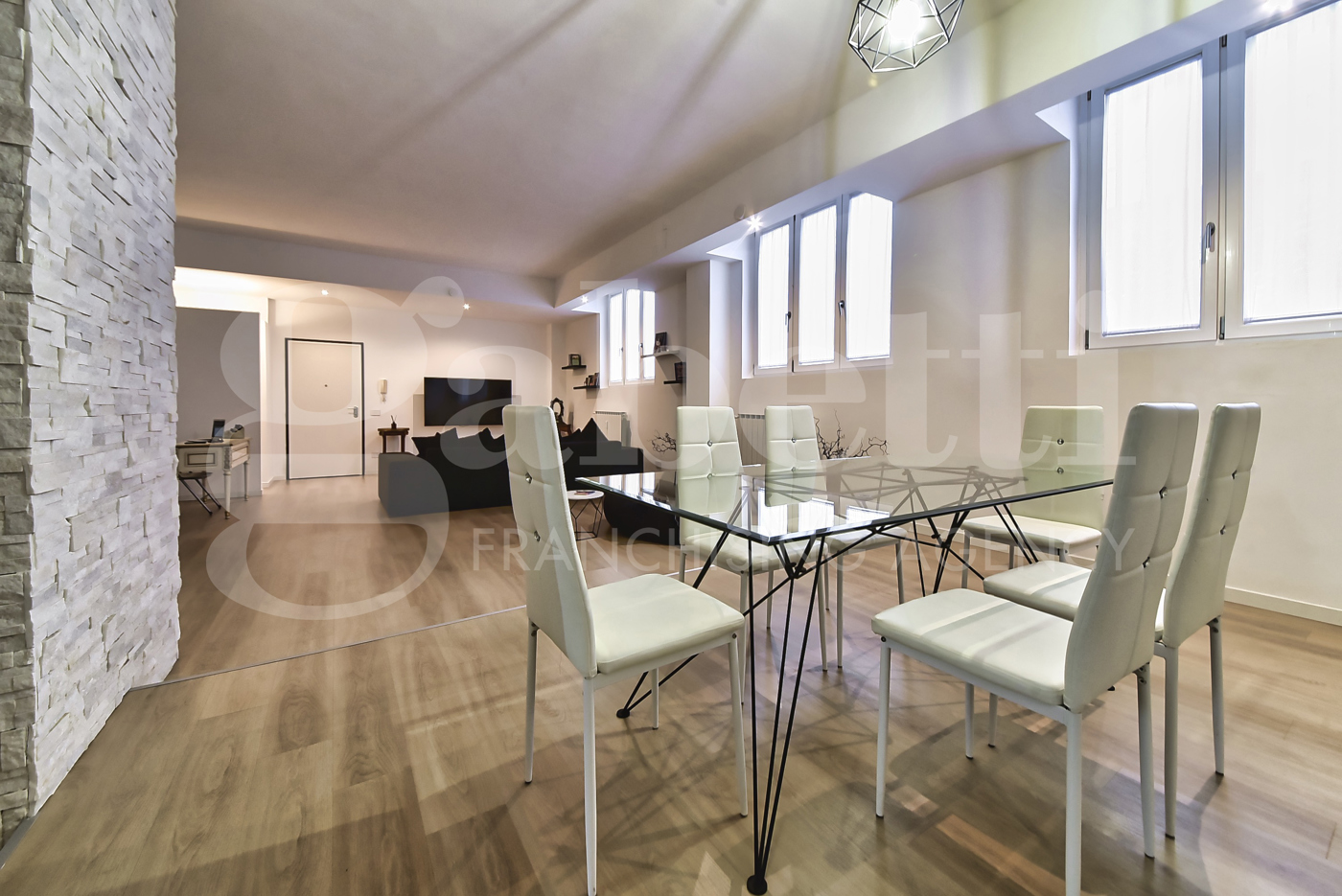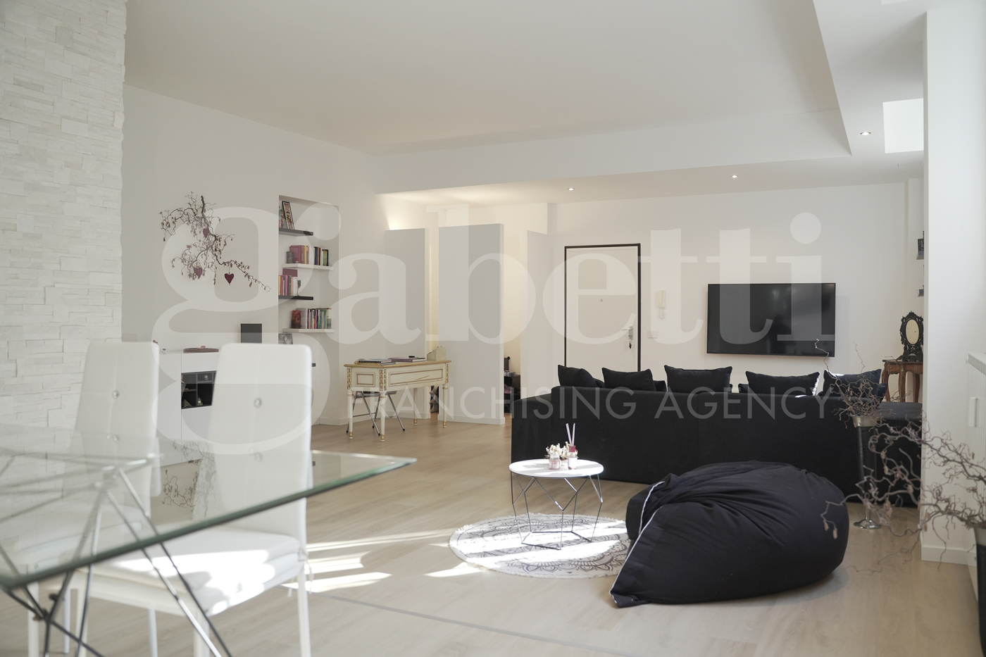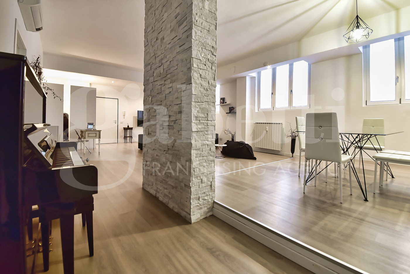 Gli ambienti sono cos disposti: INGRESSO che introduce allAMPIO SALONE DOPPIO di circa 65 mq con CUCINA A VISTA, ambiente particolarmente luminoso grazie alle tre grandi finestre presenti nella zona LIVING, una generosa CAMERA con CABINA ARMADIO, BAGNO e RIPOSTIGLIO.