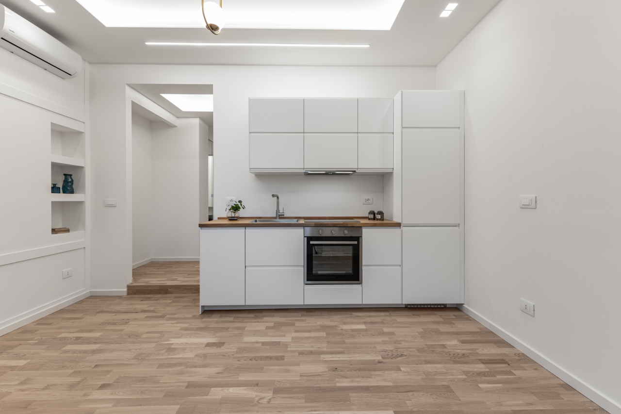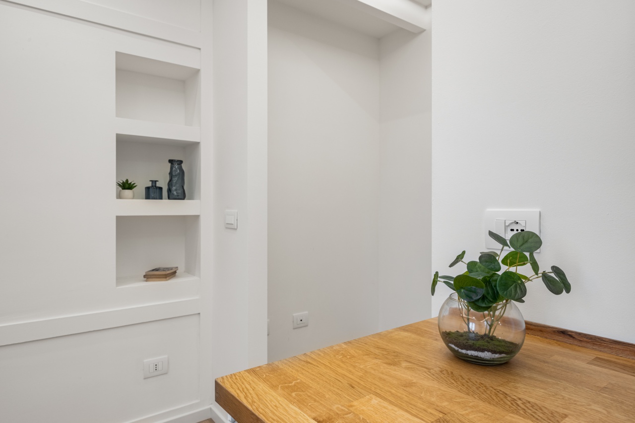 Ambienti: Ampio Living con cucina in arredo Total White, Camera da letto con nicchie su misura, ripostiglio, Bagno con ampio box doccia, . Caratteristiche principali: Illuminazione a led con luci dirette e indirette, ideali per creare un'atmosfera sempre diversa garantendo un elevato standard di comfort visivo, Impianto di condizionamento, Riscaldamento autonomo ad aria (totol green) , in tutto l'appartamento troviamo Parquet di Rovere tonalità rovere chiaro con posa alla Francese, Rivestimenti bagno in marmo con disegno Floreale, made in Italy, Serramenti in Legno con vetro doppio, oscurati da persiane a scomparsa, massima espressione di isolamento termico e acustico, uniti ad un elevato valore estetico e funzionale, Lavabo e sanitari sospesi di design, Porte interne in stile con gli ambienti.