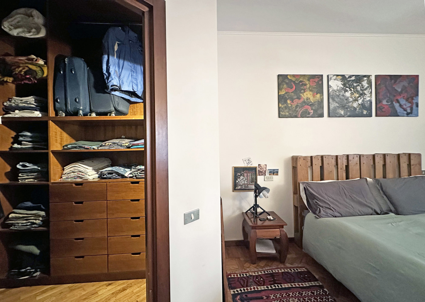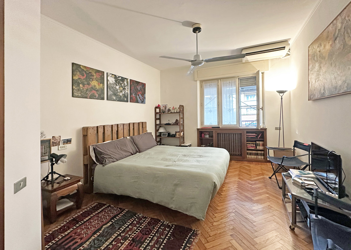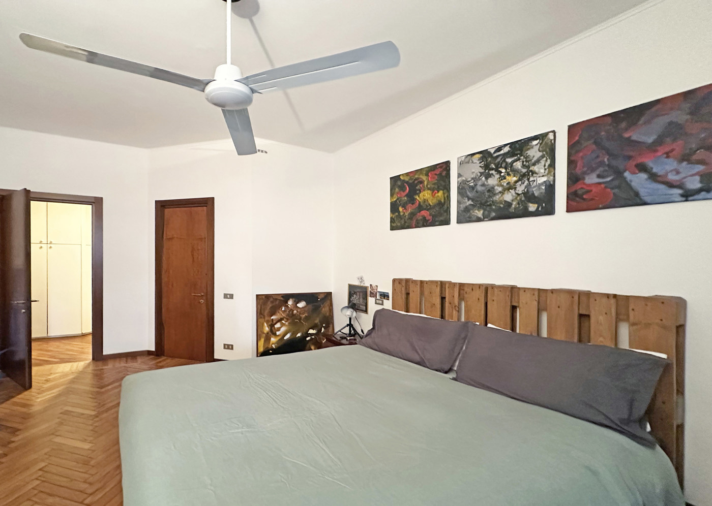 La camera matrimoniale, spaziosa e accogliente, valorizzata da una splendida pavimentazione in parquet a spina di pesce e arricchita da una graziosa e pratica cabina armadio.