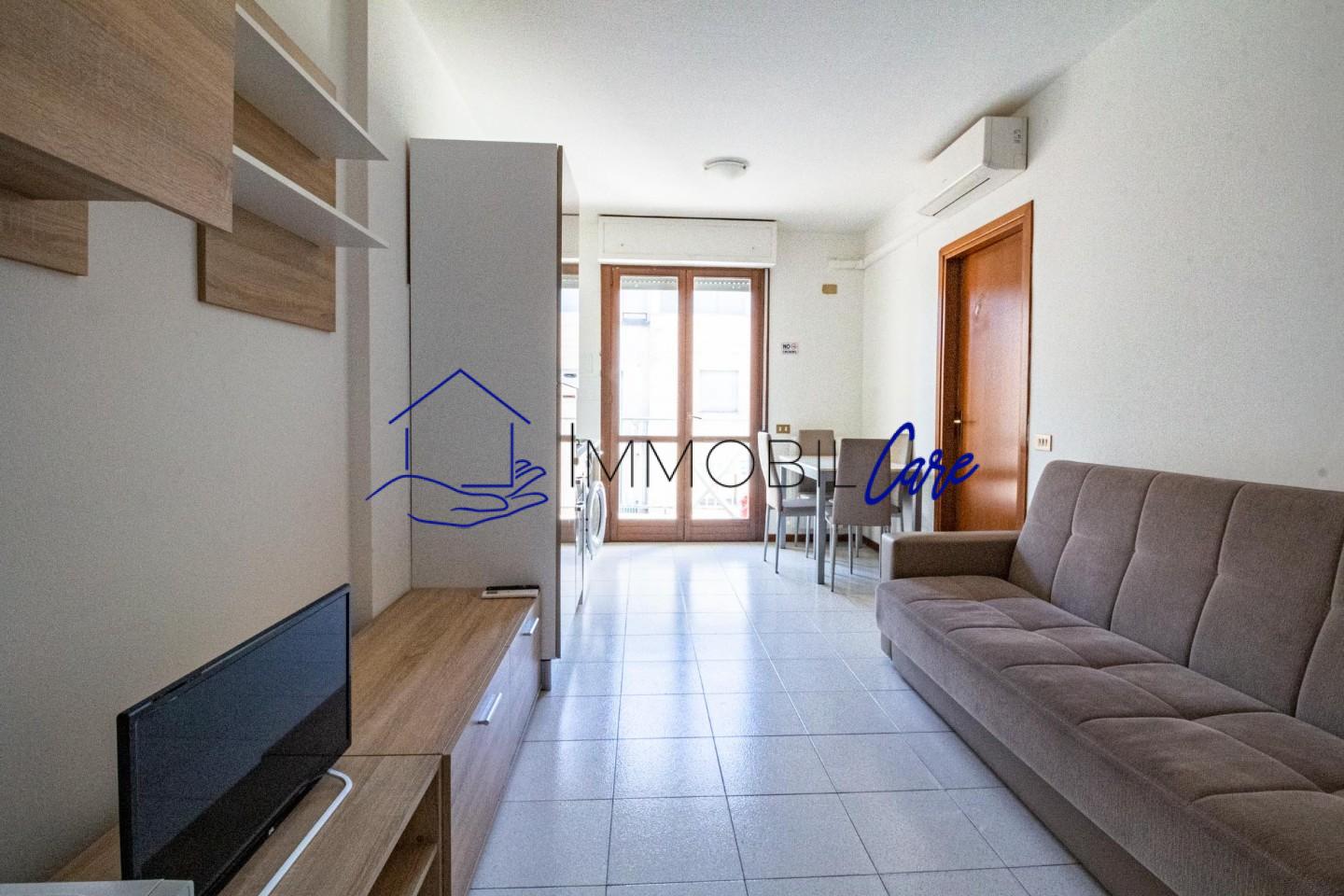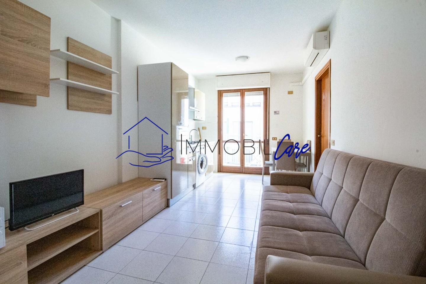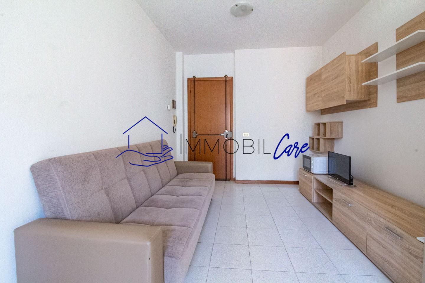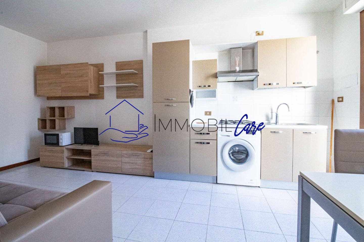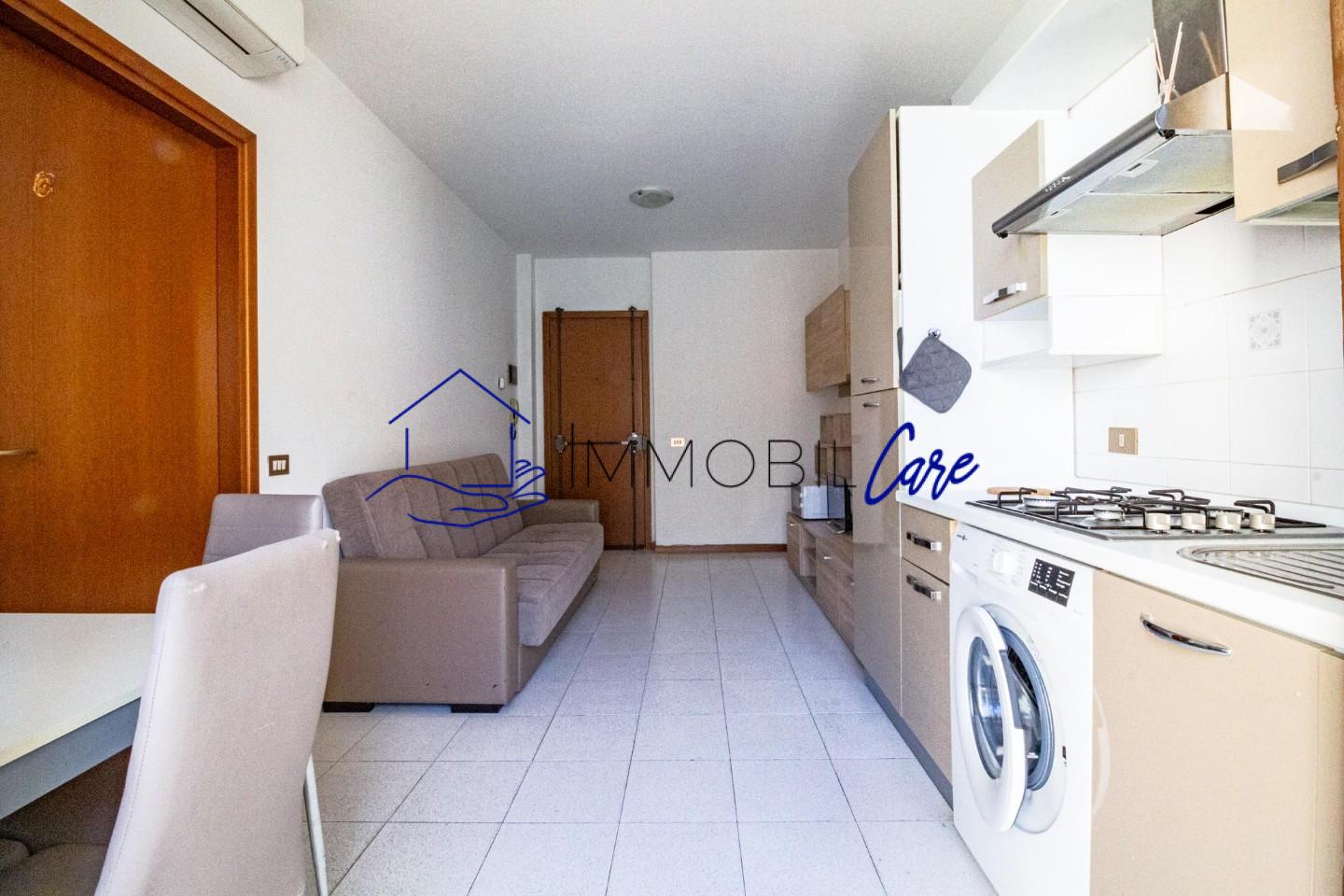 Lingresso si apre sul soggiorno con angolo cottura a vista, dotato di una porta-finestra che conduce al comodo balcone.