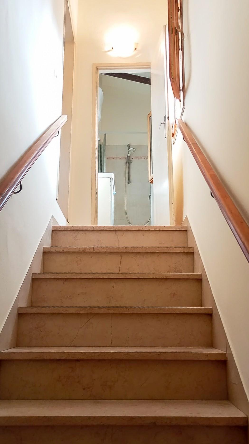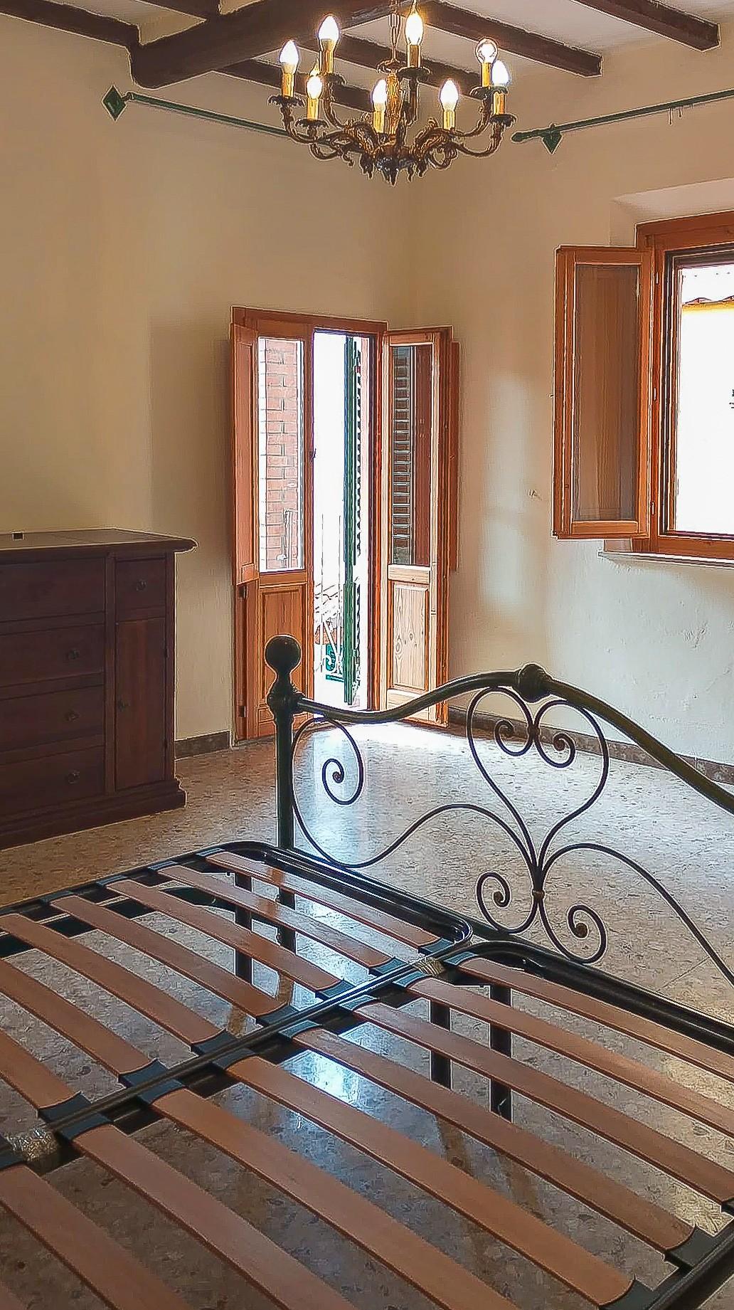 Il piano terra ospita la zona giorno con cucina e un ripostiglio, mentre al piano superiore si trovano la camera matrimoniale dotata di piccolo balcone e un bagno finestrato.