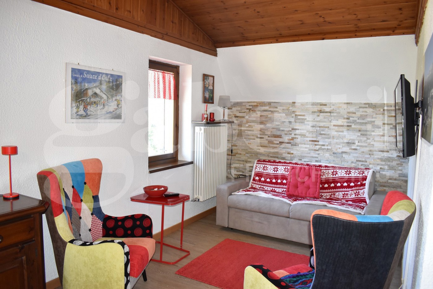 Gran Villard - via Chambre d'Or condominio Il Pino Ampio appartamento al secondo e ultimo piano, parzialmente ristrutturato e composto da ingresso, ampia zona giorno con caminetto, balcone con vista sulla vallata con possibilit di ricavare una cameretta secondaria, una camera da letto matrimoniale con balcone lato ingresso e un servizio finestrato completamente ristrutturato.