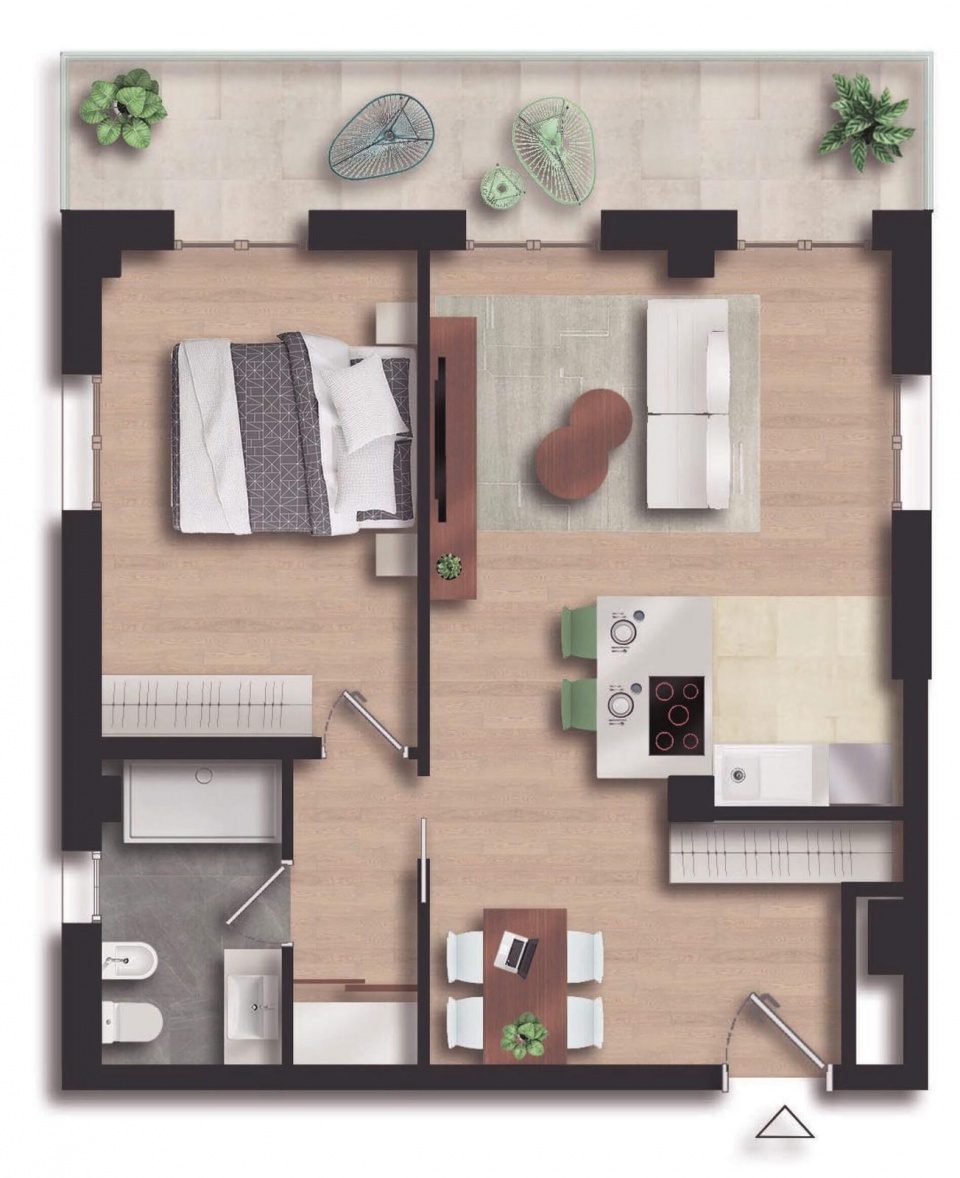 L'immobile piano intermedio dello stabile, gode di una tripla esposizione ed e' composto da ingresso, soggiorno con cucina a vista, camera matrimoniale, bagno ed panoramico e vivibile terrazzo, per una metratura complessiva di circa 70 mq. Moderne e ricercate le finiture ed i confort di cui dispone la casa, dall'impianto di domotica, riscaldamento e raffrescamento a pavimento, pavimentazione parquet in tutti gli ambienti e serramenti in doppio vetro a taglio termico, tapparelle motorizzate ed illuminazione con faretti a binario e strisce led incassate a soffitto, tutte dotazioni queste, che garantiscono un'elevato risparmio energetico, portando la classe di efficienza ad un livello attuale decisamente alto. Possibilità di posto auto al prezzo di Euro 20.000,00 e di un vano cantina, sempre a parte dal costo dell'immobile, ad Euro 9.000,00. Per ulteriori informazioni e visite sul posto, non esitate a contattarci.
